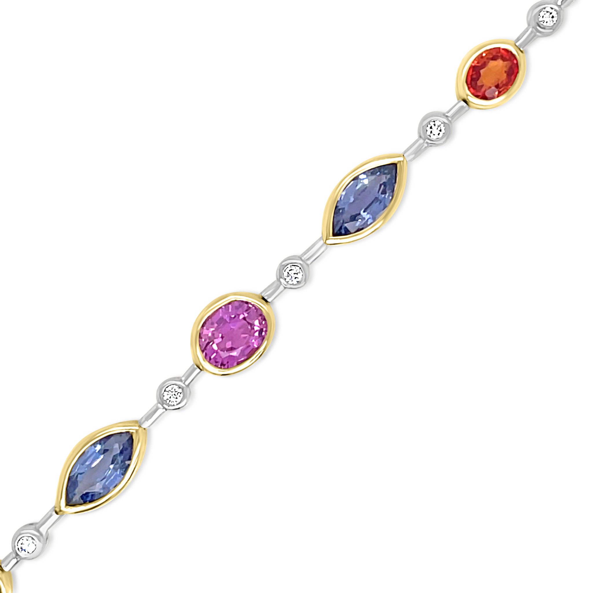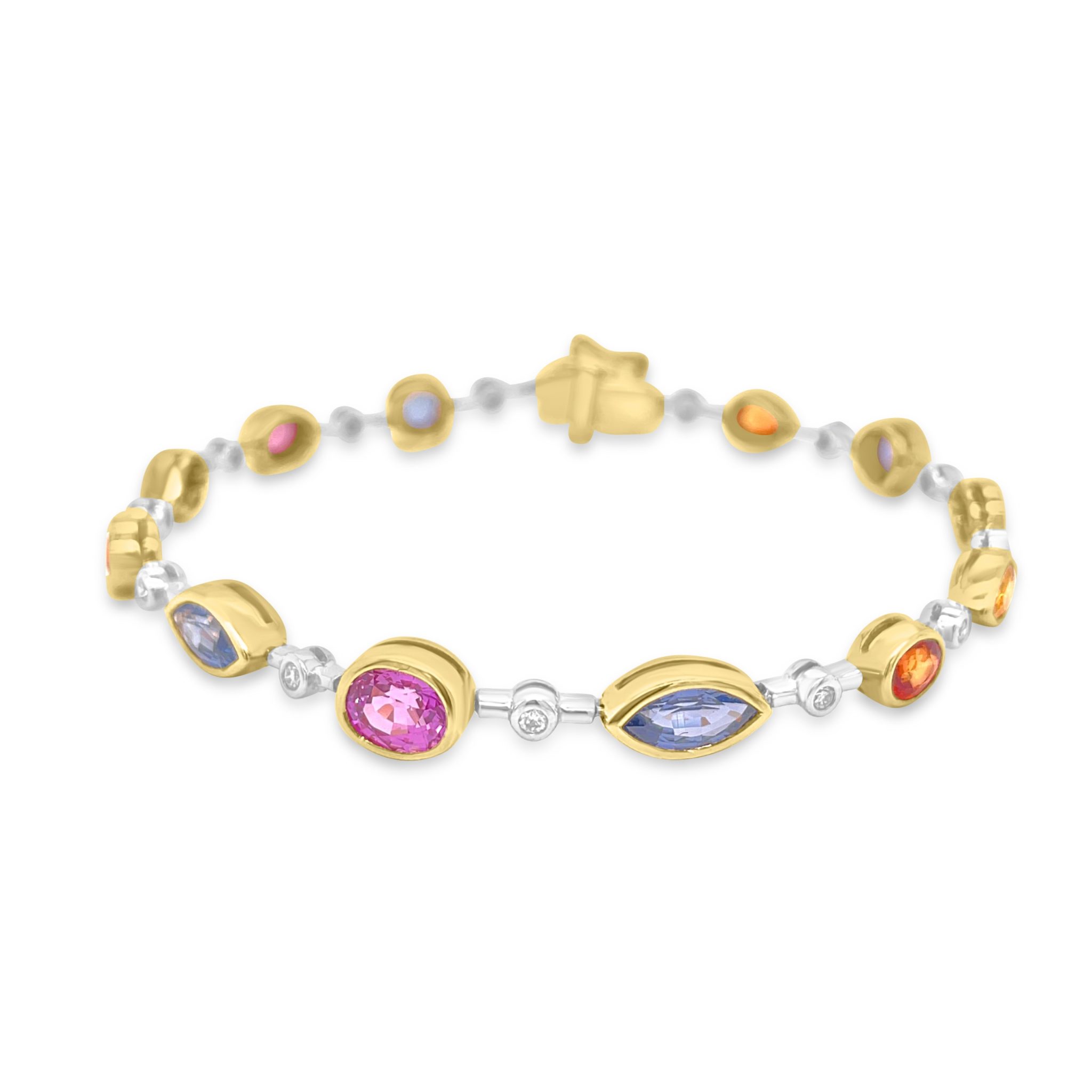 This fun and pretty 14 karat yellow gold sapphire bracelet is the perfect addition to your jewelry collection. The bracelet features 6.66 cttw multi colored sapphires in varying shapes, bezel set and alternating with .24cttw diamonds.