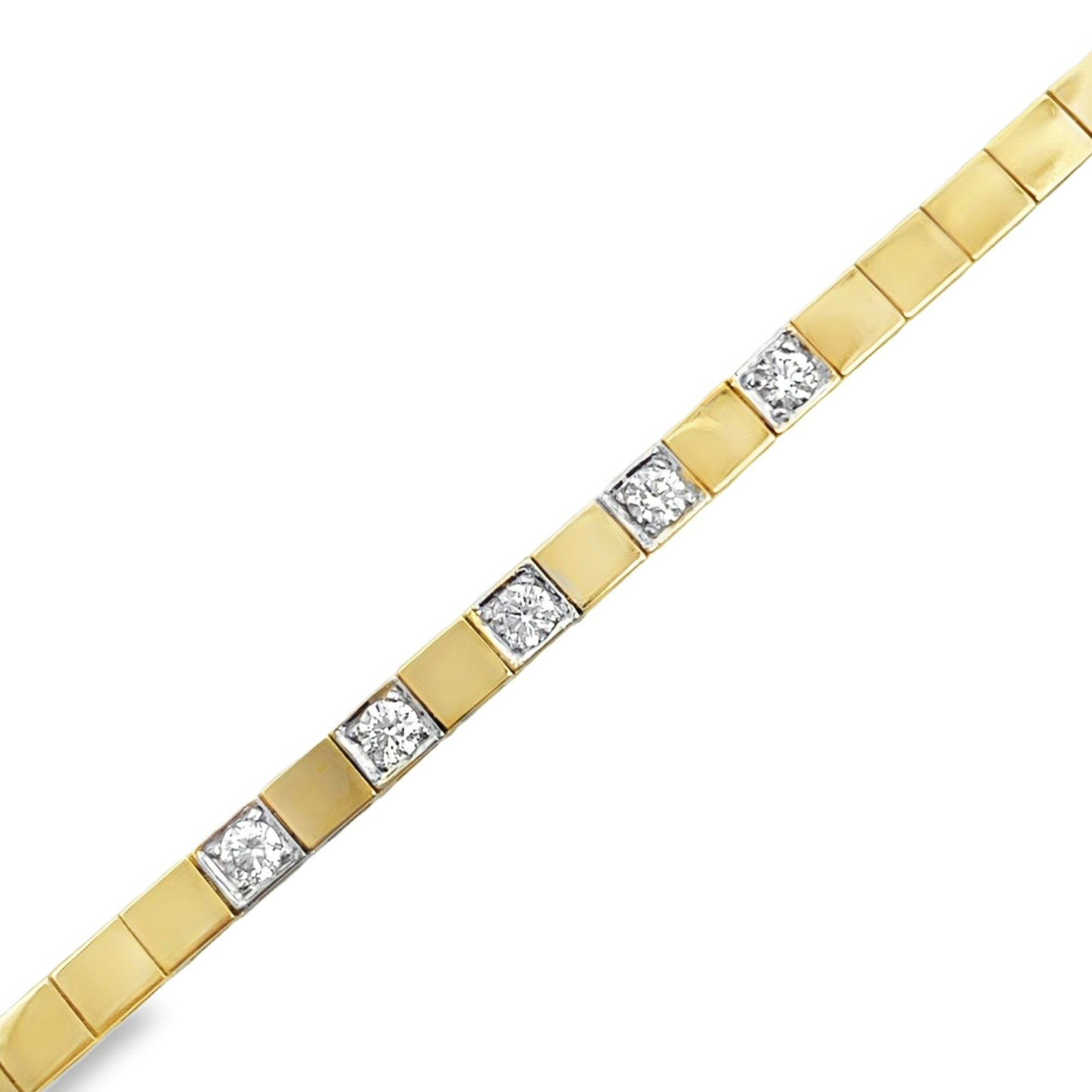 Create a bracelet that is unique to you! This 14 karat yellow gold add-a-diamond bracelet features 0.40 carats of round brilliant cut diamonds. The bracelet is approximately 3mm wide and 7.5″ long.
