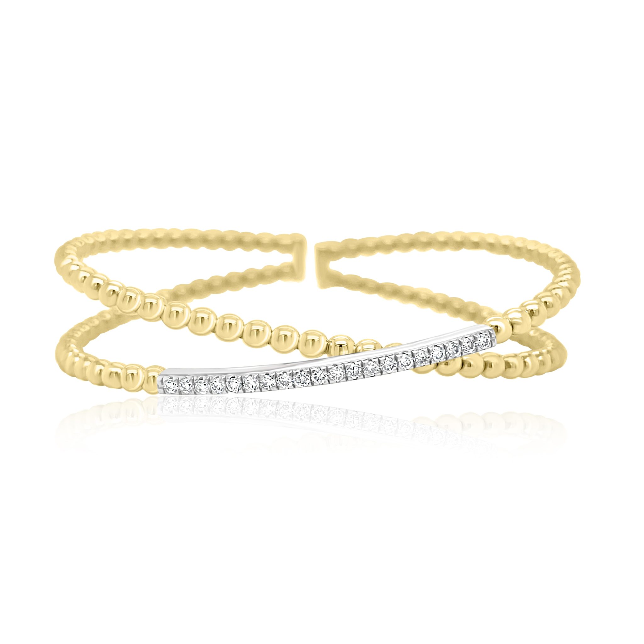 Beautiful 18 karat yellow and white gold stretch bangle bracelet with 0.35 cttw round brilliant cut diamonds in a criss cross fashion.