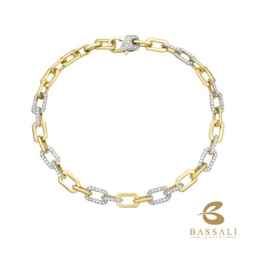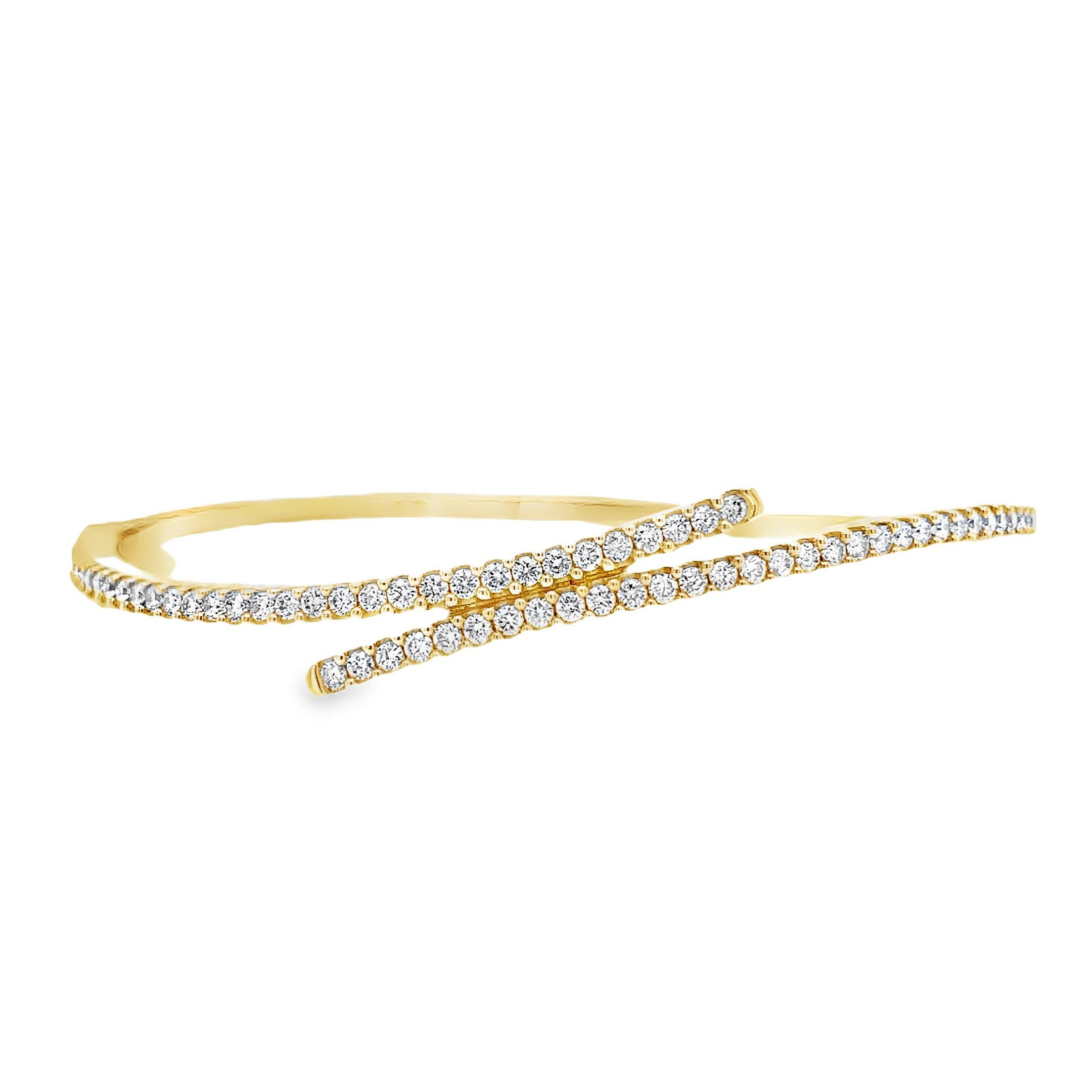 Unique 14 karat yellow gold bypass style bangle bracelet with 1.10cttw round brilliant cut diamonds.