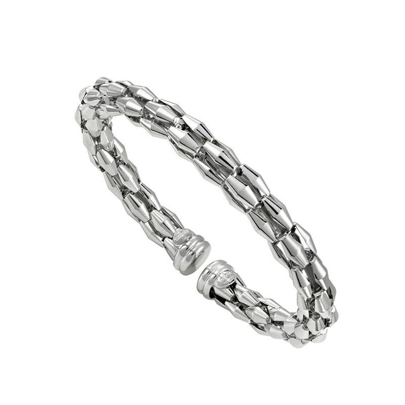Sterling silver 6mm wide “Birdcage” cuff bracelet with stainless steel center. Rhodium plated to be hypo-allergenic and tarnish free. Returns or Exchanges for 30 days ONLY on all silver jewelry.