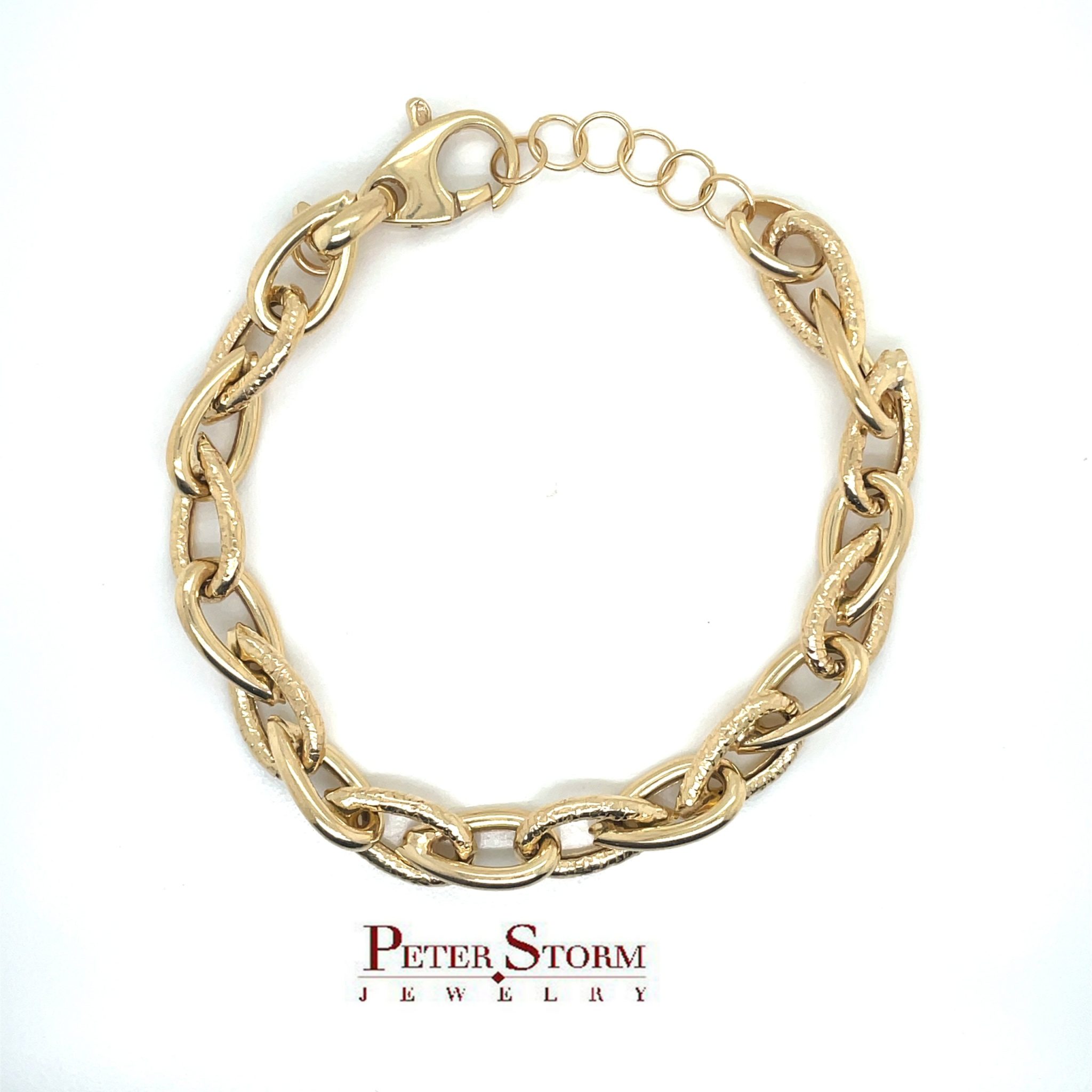 Sterling silver 18 karat yellow gold vermeil pear shaped textured link bracelet by Peter Storm. Adjustable from 7-8″. One Year Warranty. Refunds or exchanges for 30 days ONLY on all silver jewelry. The yellow is vermeil (pronounced ver-may) or washed ingold. The silver is washed in gold before the product is made, keeping the pieces bright. Vermeil is material that is composed of a thick layer of gold over solid sterling silver. While industry standards dictate that the gold portion must be 10 karats or above for a piece to be considered vermeil in the U.S., Peter Storm uses 18 karat gold and the thickness of the gold portion is much heavier than that of simple gold plated pieces.. He also uses rare earth magnetic clasps which mean that they almost put themselves on! You can clip the bracelets and necklaces together in endless creative ways. Also available in 18″ and 36″.