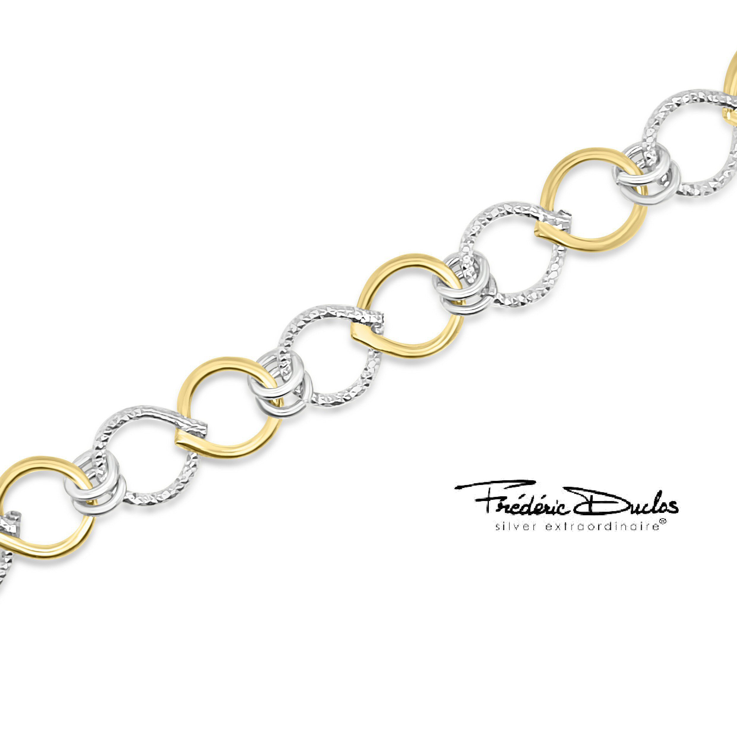 Sterling silver and 18 karat yellow gold plated “Deidra” bracelet by Frederic Duclos. This sterling silver bracelet consists of interlocking circles and rings. Every other link is plated with either rhodium for a bright shiny tarnish free silver color and18 karat yellow gold vermeil. The yellow links are high polished and the white links are diamond cut. It is adjustable from 7″-8″ long.