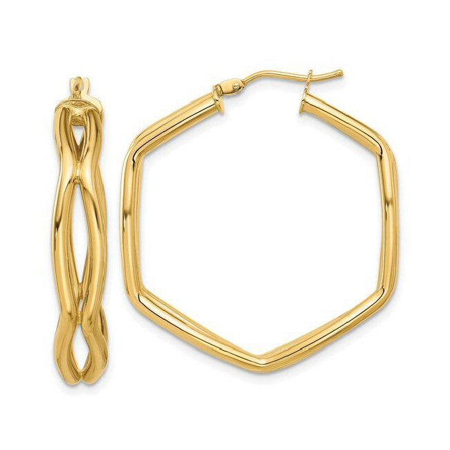 14 karat yellow gold polished geometric hoop earrings. Lifetime warranty.