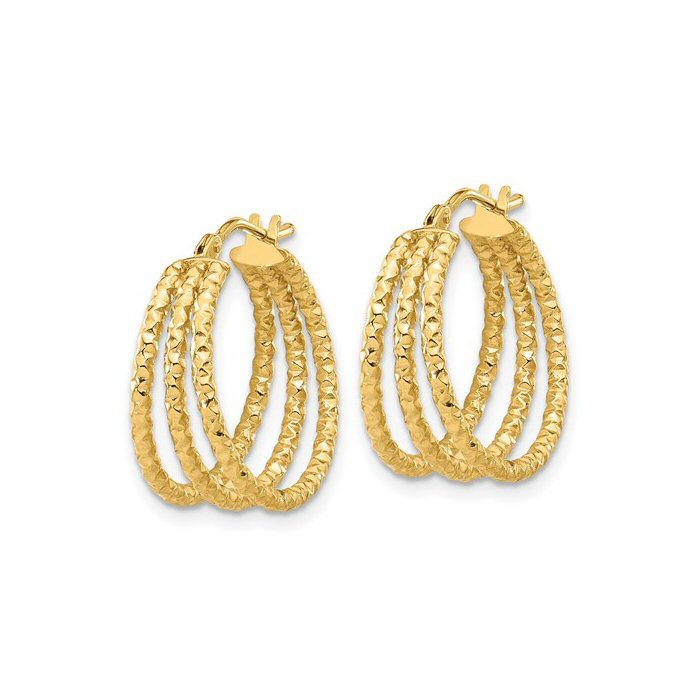14 karat yellow gold polished and textured triple row hoop earrings. Lifetime Warranty.