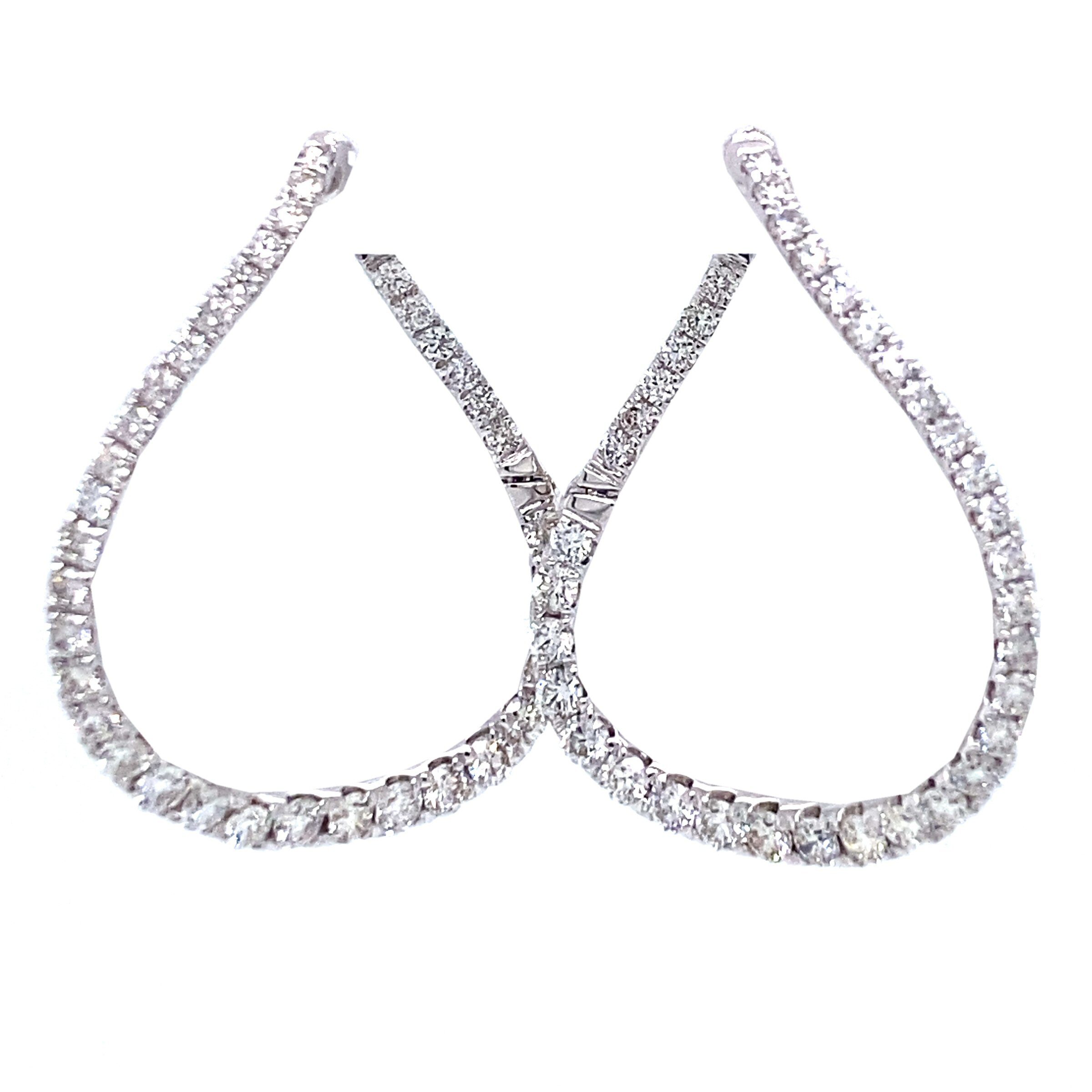 totally interesting 14 karat white gold front and back pear shaped hoop earrings with 1.89cttw round brilliant cut diamonds. 1 1/4″ long.