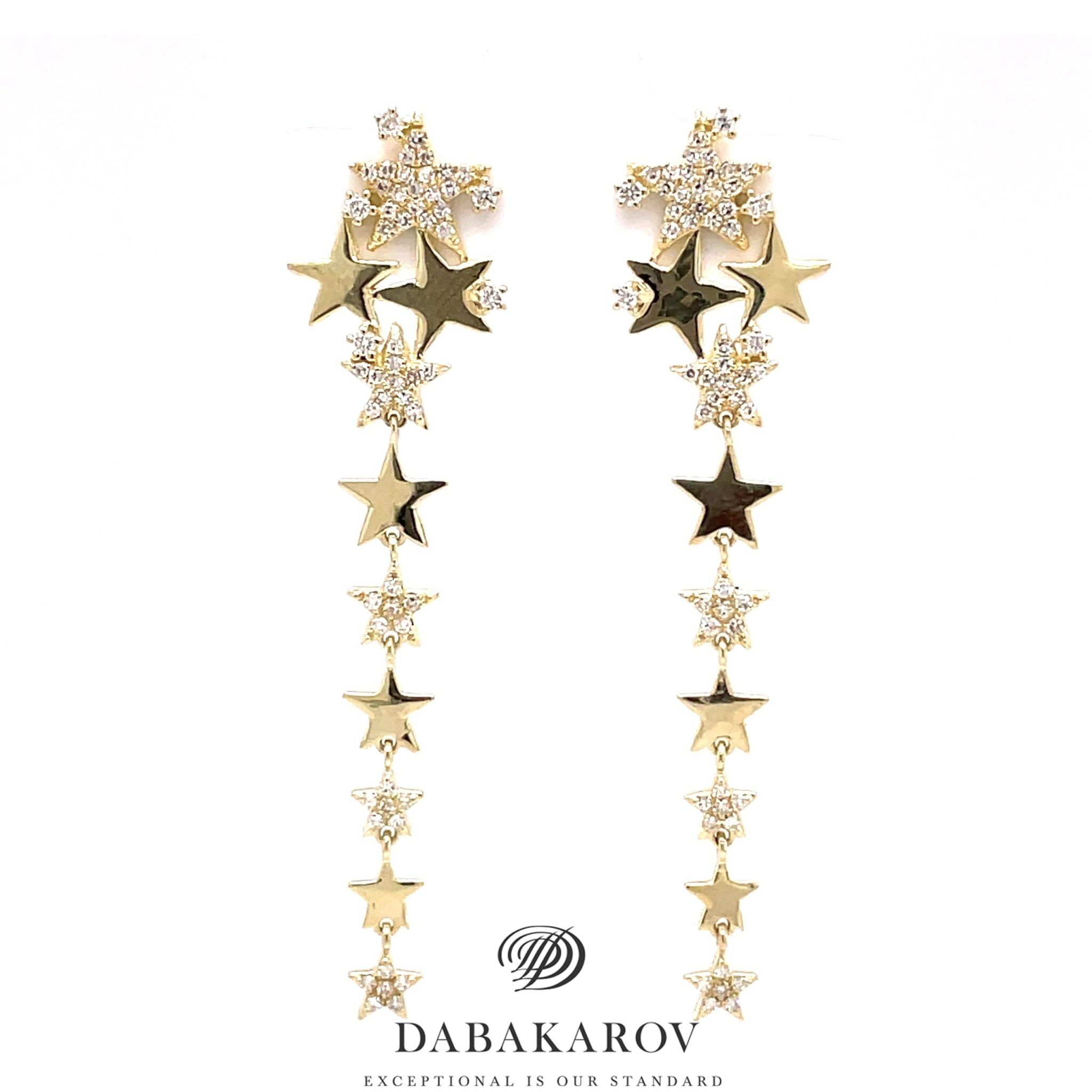 Whimsical dangling star post earrings with 0.40 cttw round brilliant cut diamonds in 14 karat yellow gold. (15 stars in each earring)