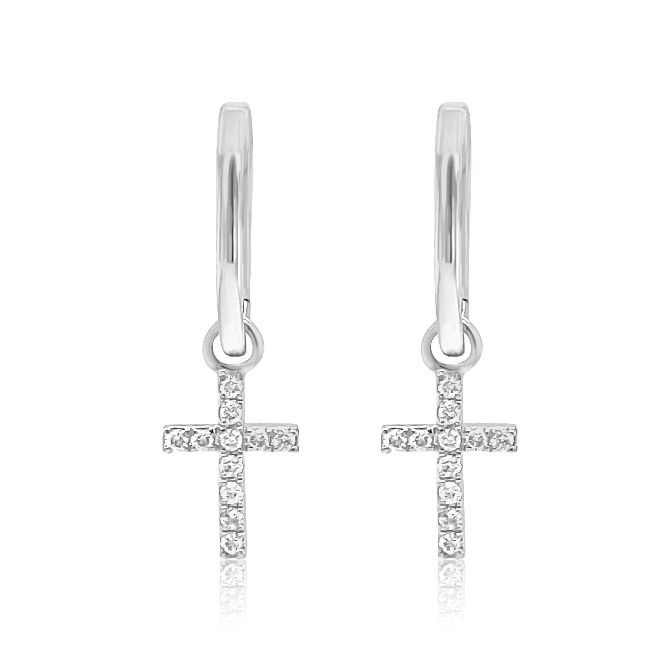 14 karat white gold hoops with 0.14cttw diamond crosses dangling from the center.