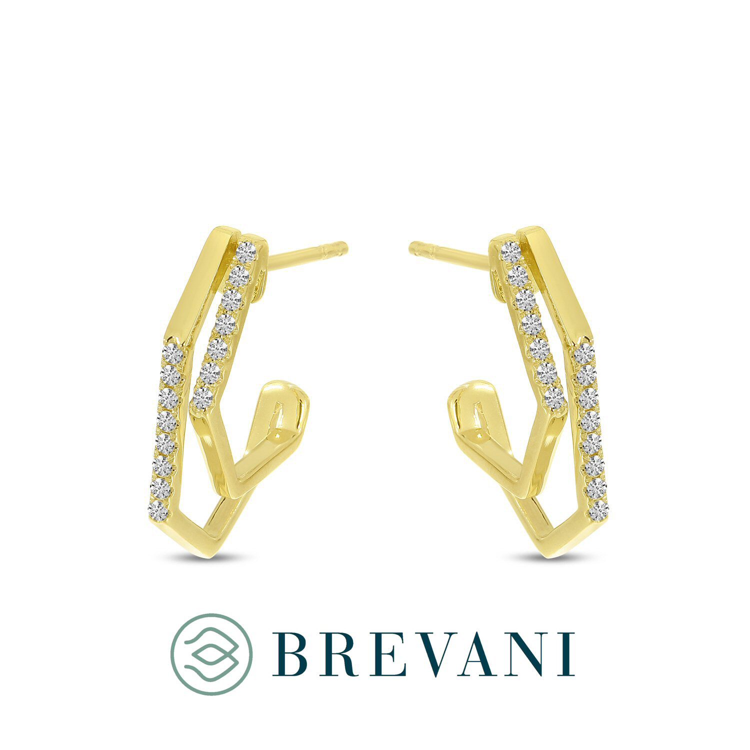14 karat yellow gold geometric shaped double hoop post earrings with 0.21cttw round brilliant cut diamonds.