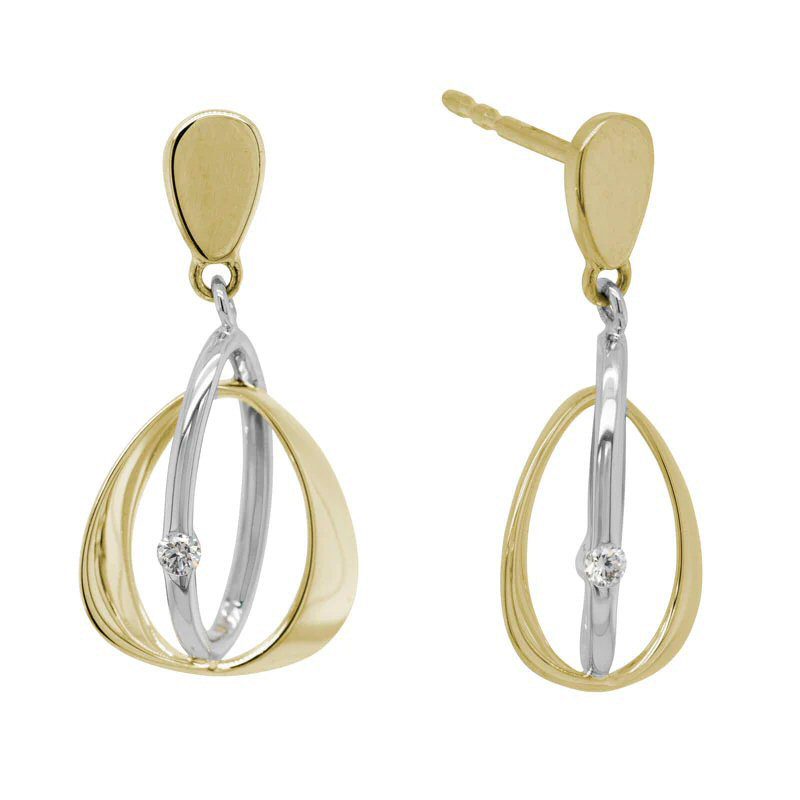 Unique 14 karat white and yellow gold moveable drop earrings with .04cttw round brilliant cut diamonds. The earrings are an open oval and abstract triangle design with a bezel set diamond in each earring. 1/2″ butterfly post earrings.