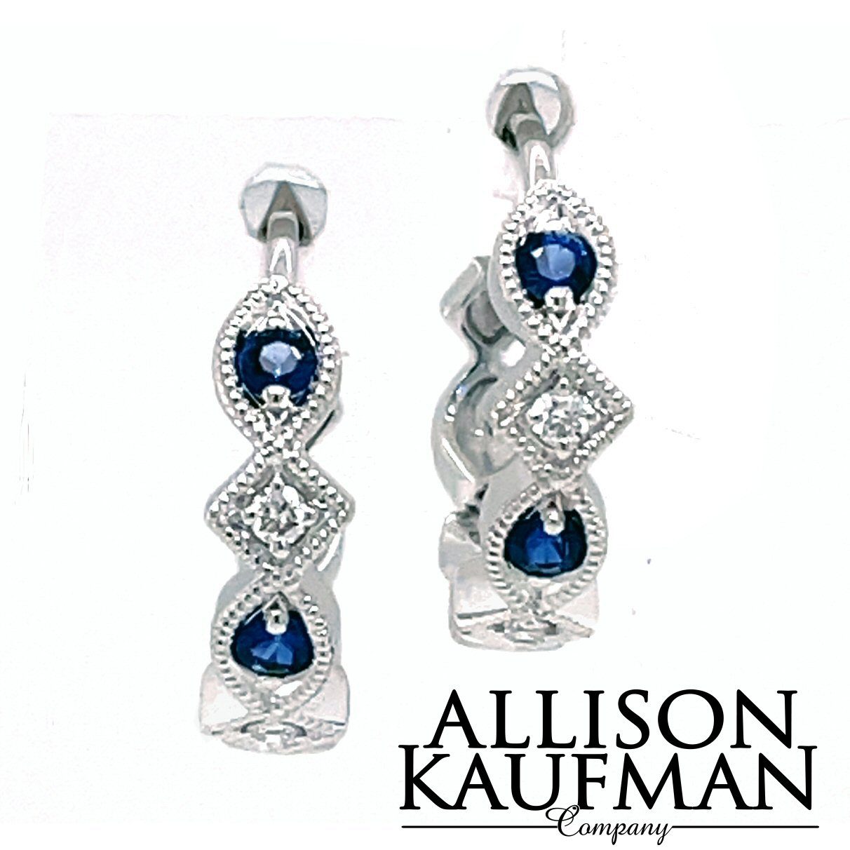 14 karat white gold sapphire and diamond hoop earrings by Allison-Kaufman .The huggie style earrings consist of 0.20 cttw sapphires and 0.05 cttw round brilliant cut diamonds. Two of each stone are prong set in these lovely earrings with milgrain edging.