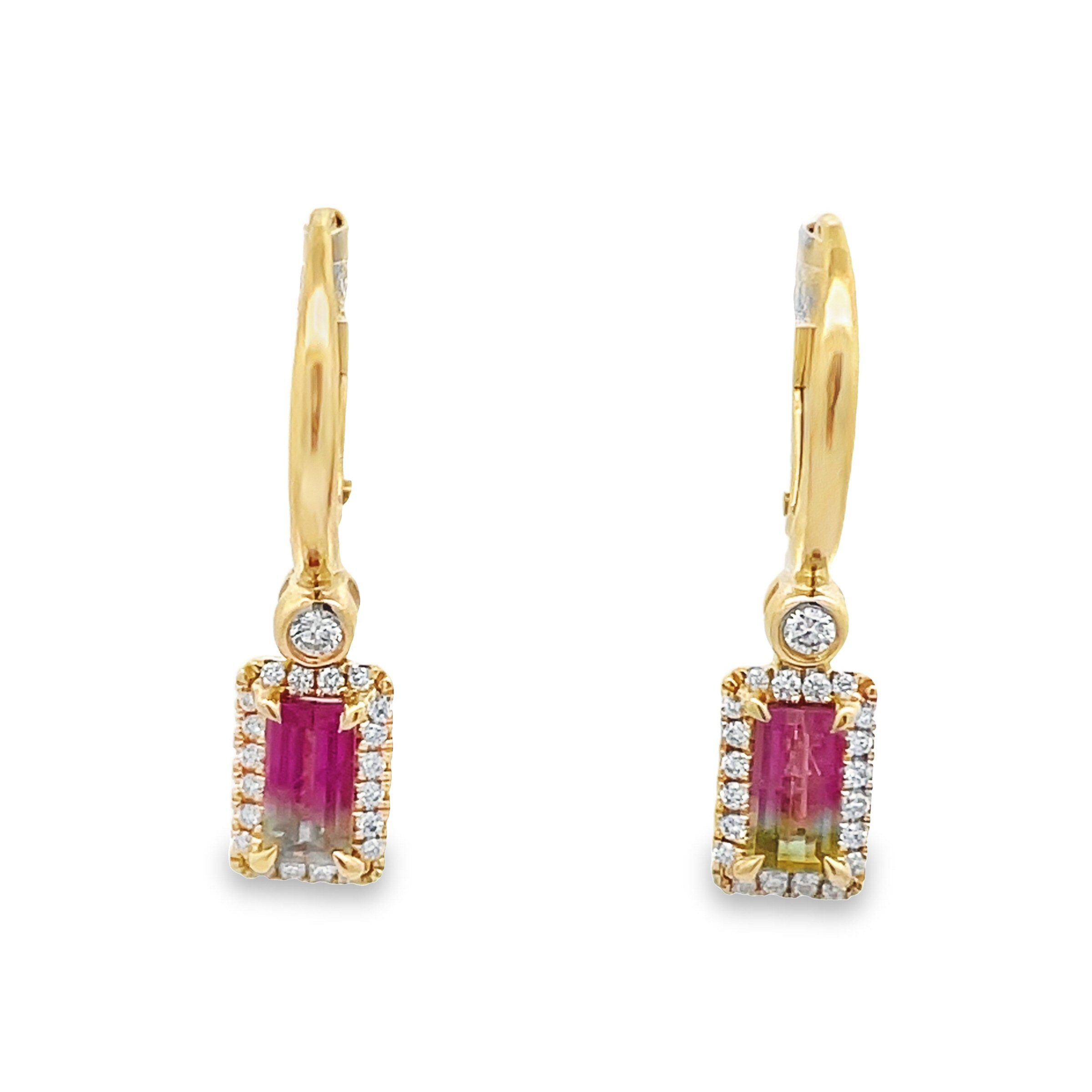These exquisite earrings feature a stunning combination of 14 karat yellow gold and vibrant gemstones. The 0.79cttw watermelon tourmalines are framed by 0.18 cttw round brilliant cut sparkling diamonds, creating a luxurious look that is perfect for any special occasion.