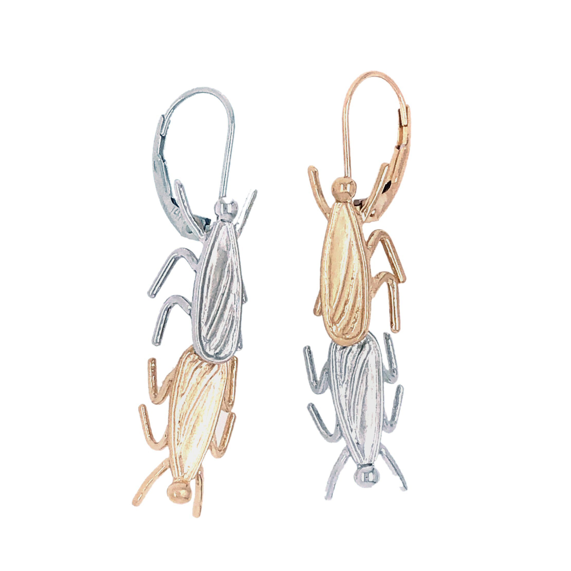Gold In Art Exclusive Design! Adorable 14 karat yellow and white gold love bug leverback earrings. There is on yellow gold love bug on the top and the white gold mate is dangling at the bottom. The other earring is the exact opposite, with the white goldbug on top and the yellow gold mate dangling at the bottom. Love bugs are only found in the state of Florida during the months of May and September .They’re on your car, on your house and landing on your windshield every time you stop-now they can be on your ears. You’re welcome.