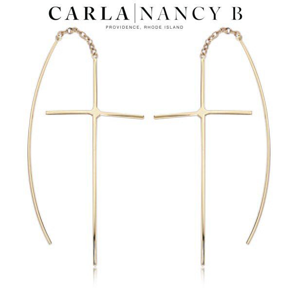 14 karat yellow gold high polished cross earring threaders. Made in the USA. Made by Carla B.