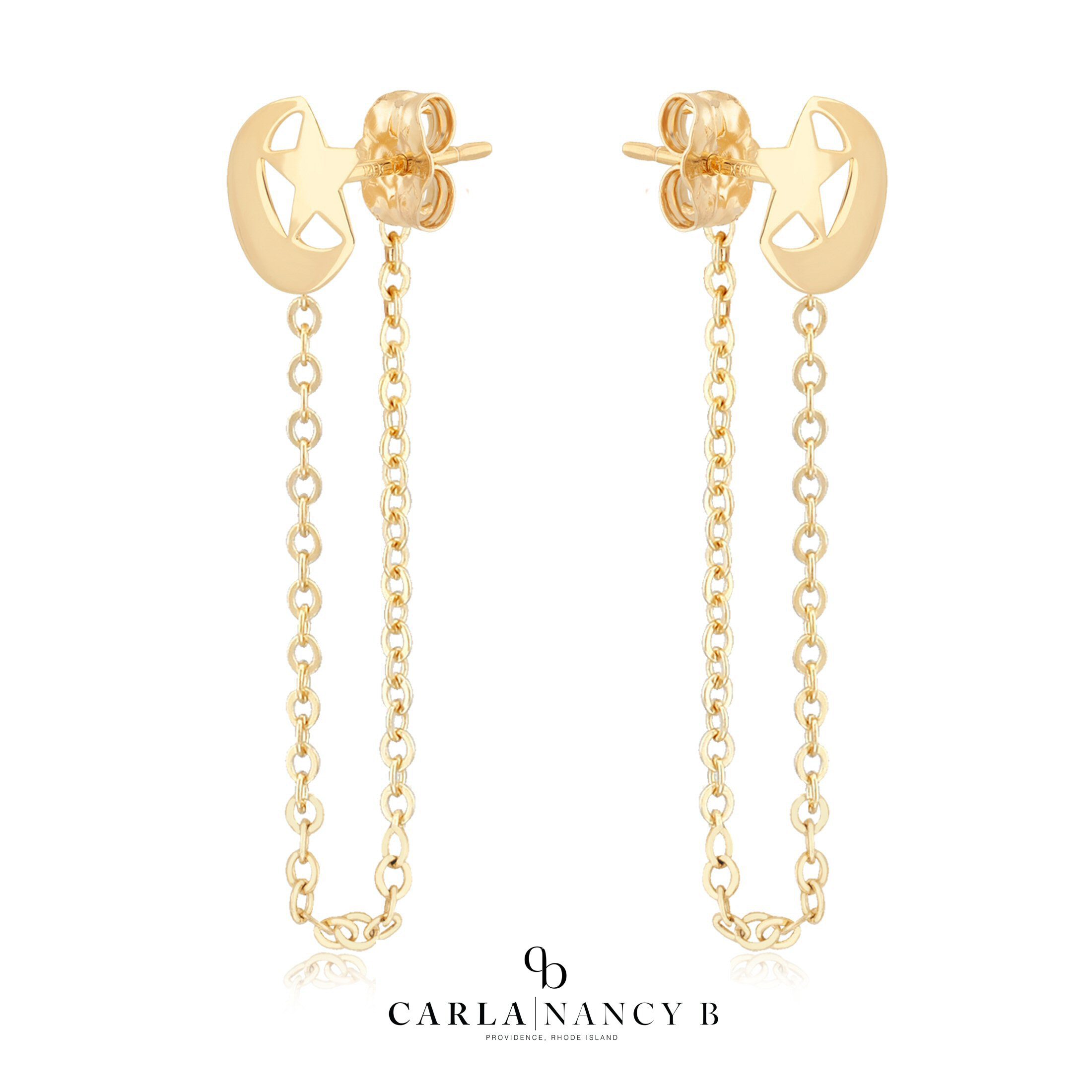 14 karat yellow gold small star and half moon drop earrings. There is a .6mm diamond cut chain dangling 3/4″ that loops from the front of the ear to the back where it attaches to the post. Made by Carla B. Made in the USA