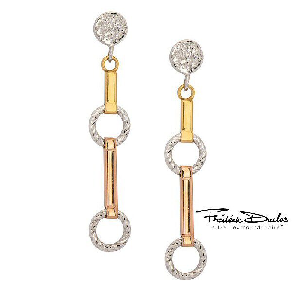 Sterling silver and 18 karat yellow and rose gold plated circle and bars earrings by Frederic Duclos. The dangling post earrings alternates high polished yellow and rose bars with the silver circles.