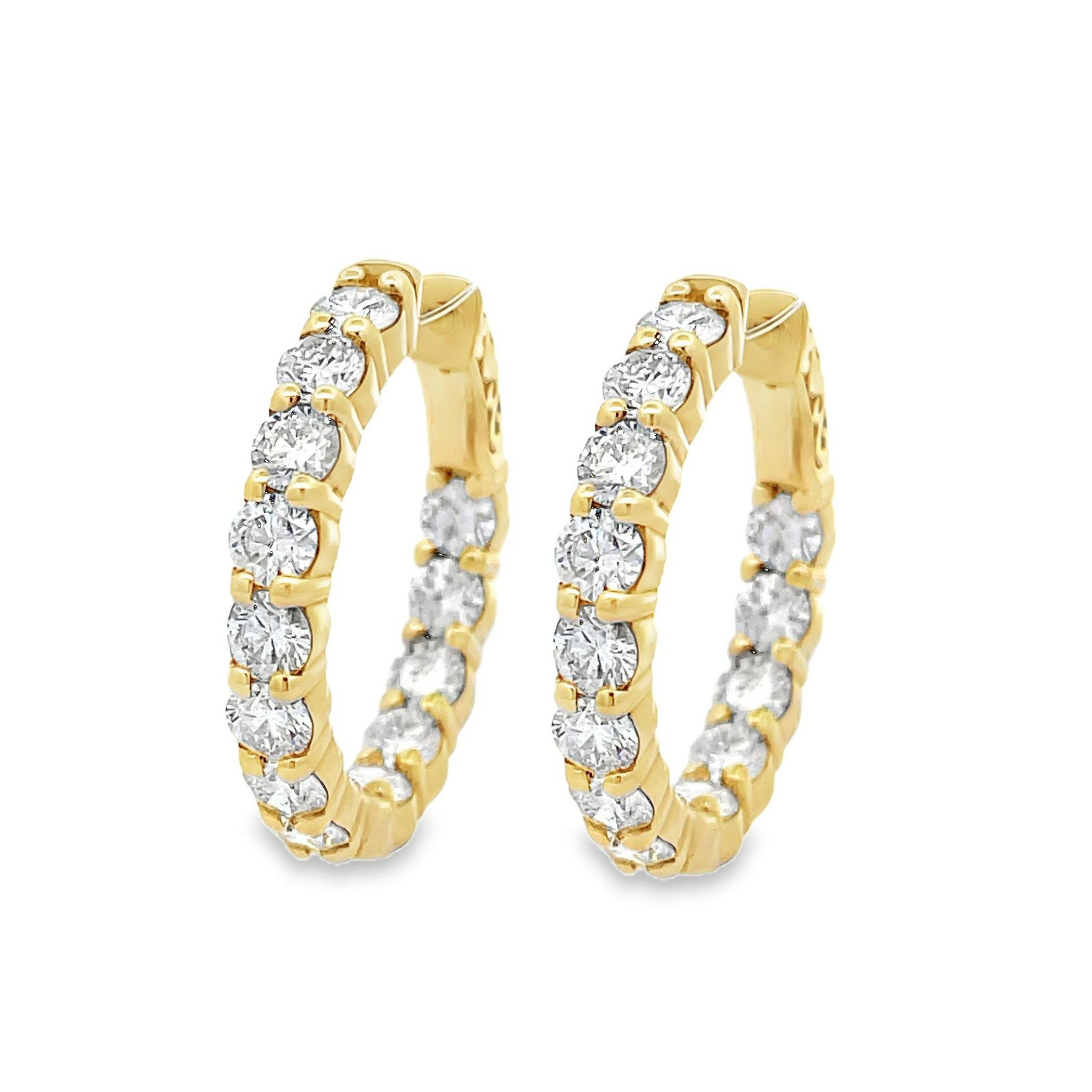 14 karat yellow gold round hoops with 3.31cttw lab grown diamonds prong set on the inside and the outside.