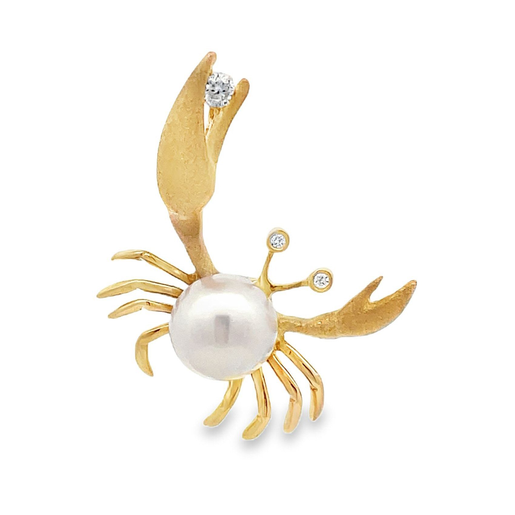 Beautiful and unusual 14 karat yellow gold crab pendant. There is a 7mm freshwater white pearl on the body and a .03 carat round brilliant cut diamond in one of the claws and .02cttw diamonds in the eyes. Designed and made by Denny Wong.