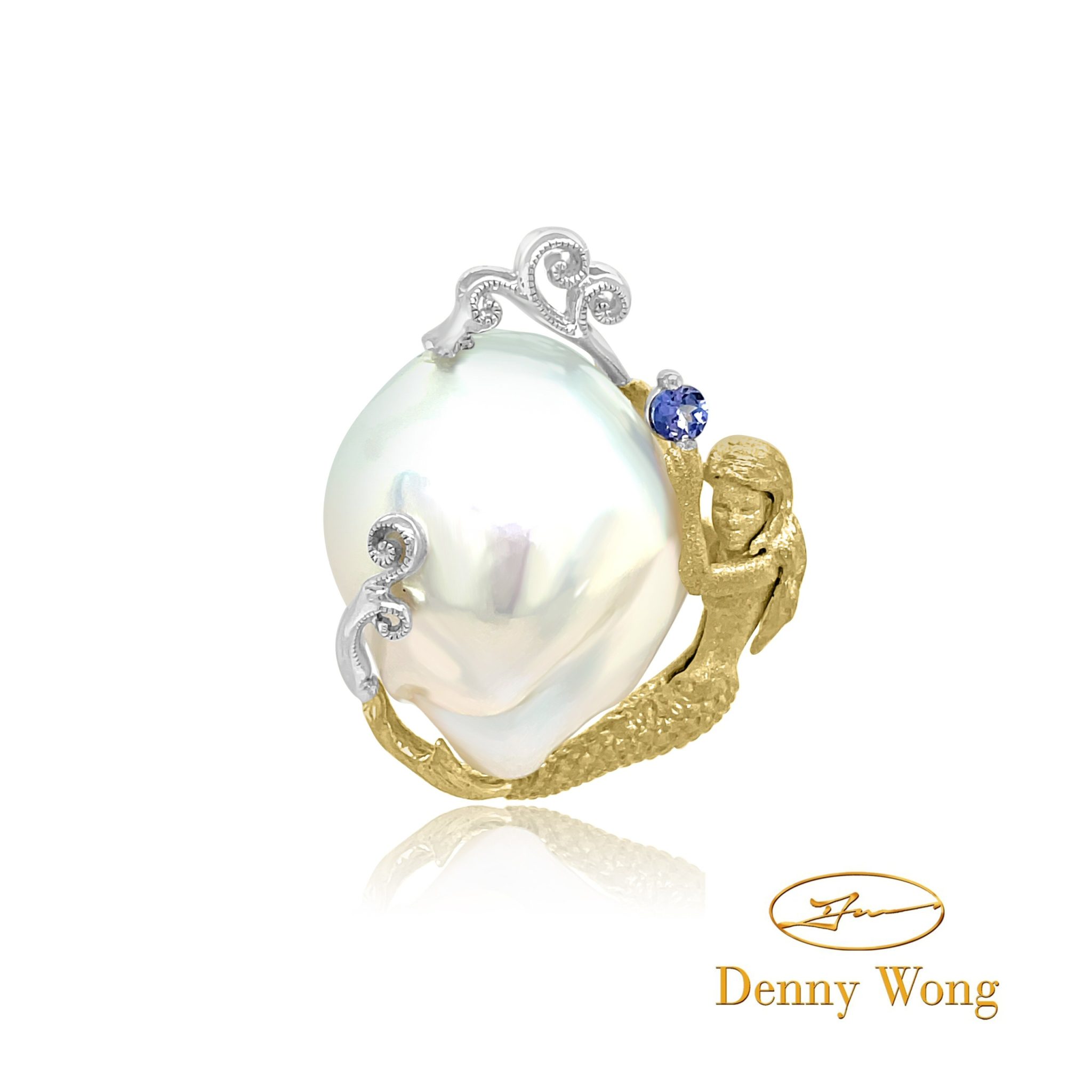 14 karat white and yellow gold pendant by Denny Wong. There is a 14 karat yellow gold mermaid wrapped around and hugging a large white freshwater pearl. She is holding a .10ct bezel set tanzanite.