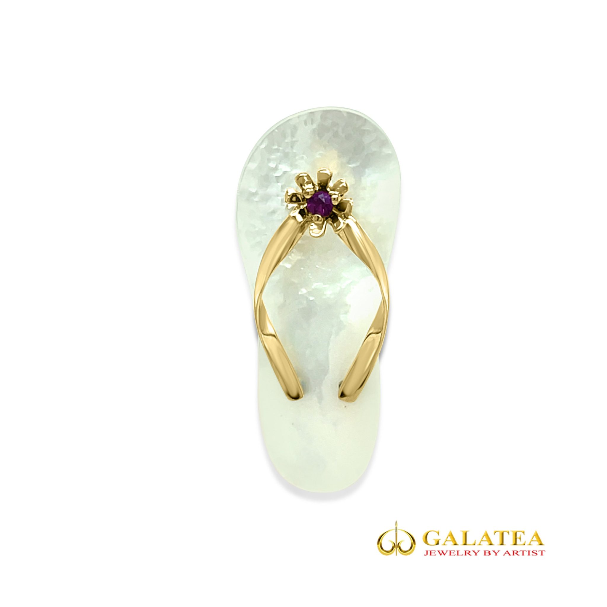 Mother of pearl “Flip Flop” accented with a 0.02 carat ruby in 14 karat yellow gold. Chain not included.
