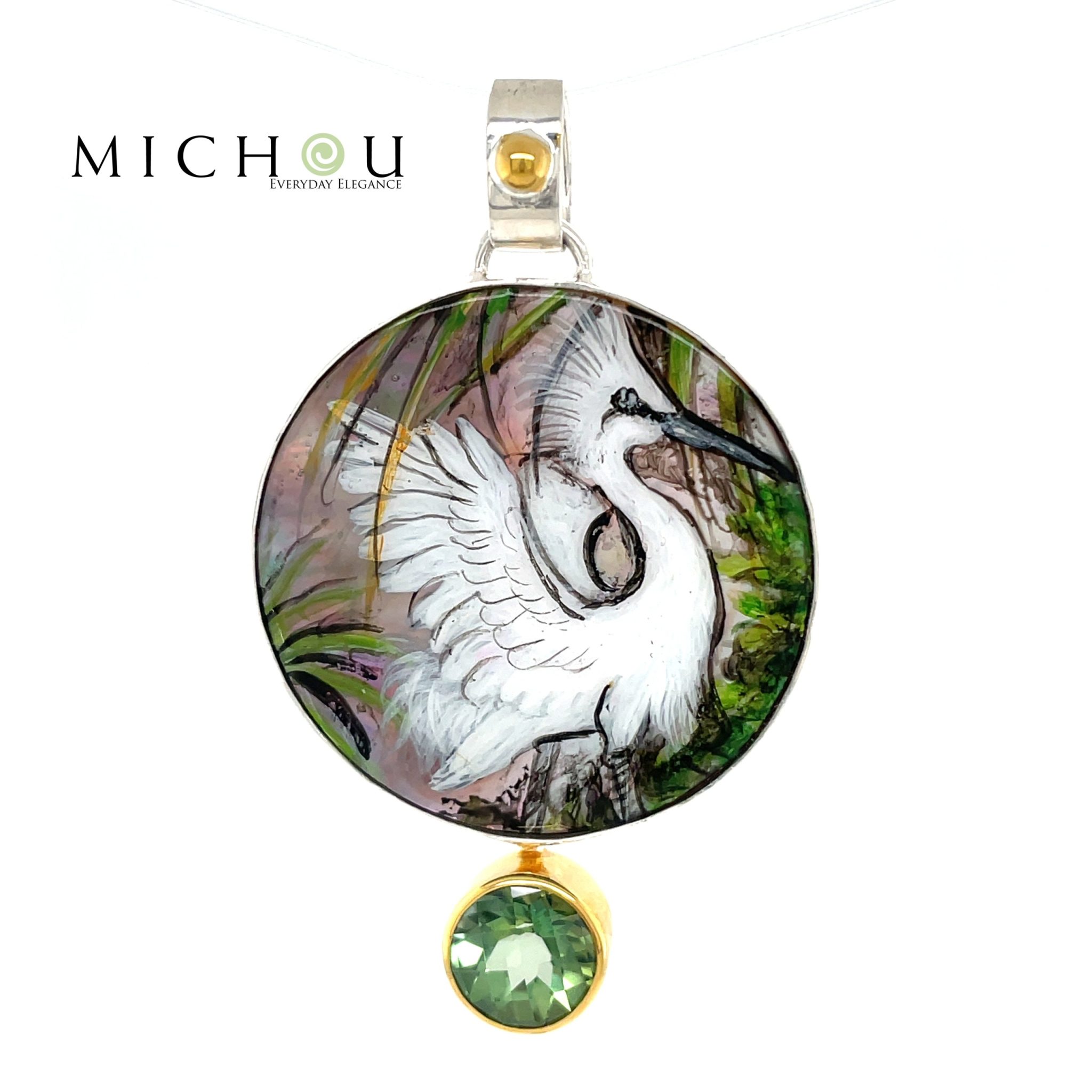 One of a kind, hand painted bird pendant in sterling silver and 22 karat gold vermeil with black mother of pearl and envy topaz.
