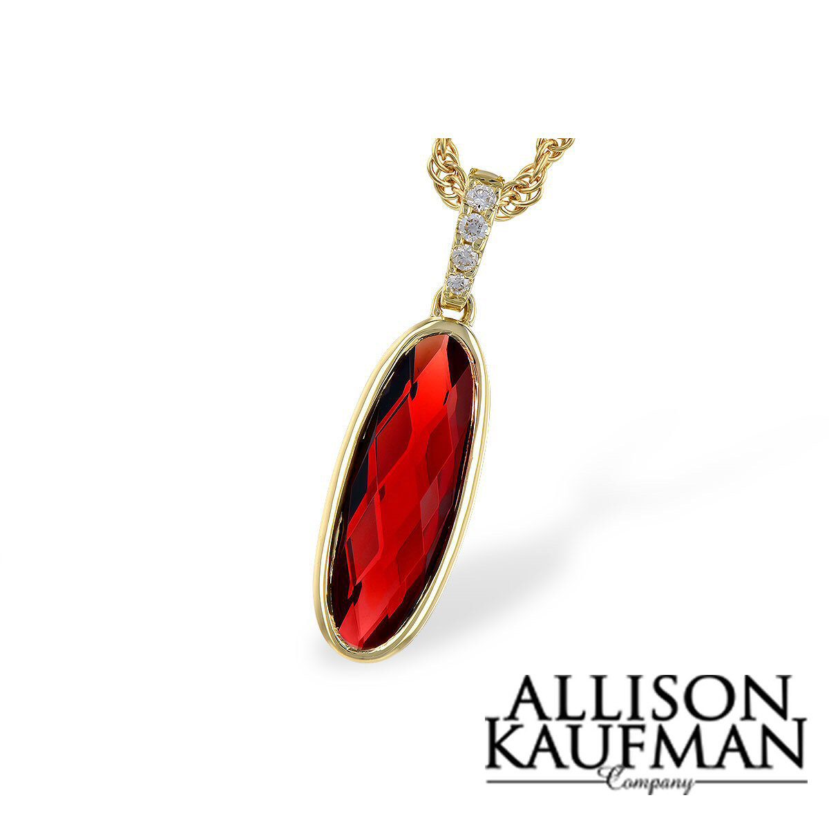 Lovely 14 karat yellow gold garnet and diamond necklace. The centerpiece of the pendant contains a 2.02 carat elongated, faceted oval garnet. The garnet is bezel set and and sits on bail with 0.03 cttw diamonds.