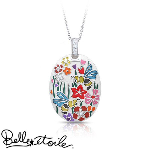 Walk through a beautiful garden with Italian Enamel bees and flowers. Translucent enamel bees happily pollinate colorful flower set with platinum-plated sterling silver and accent stones. Rejoice in the beauty of nature!