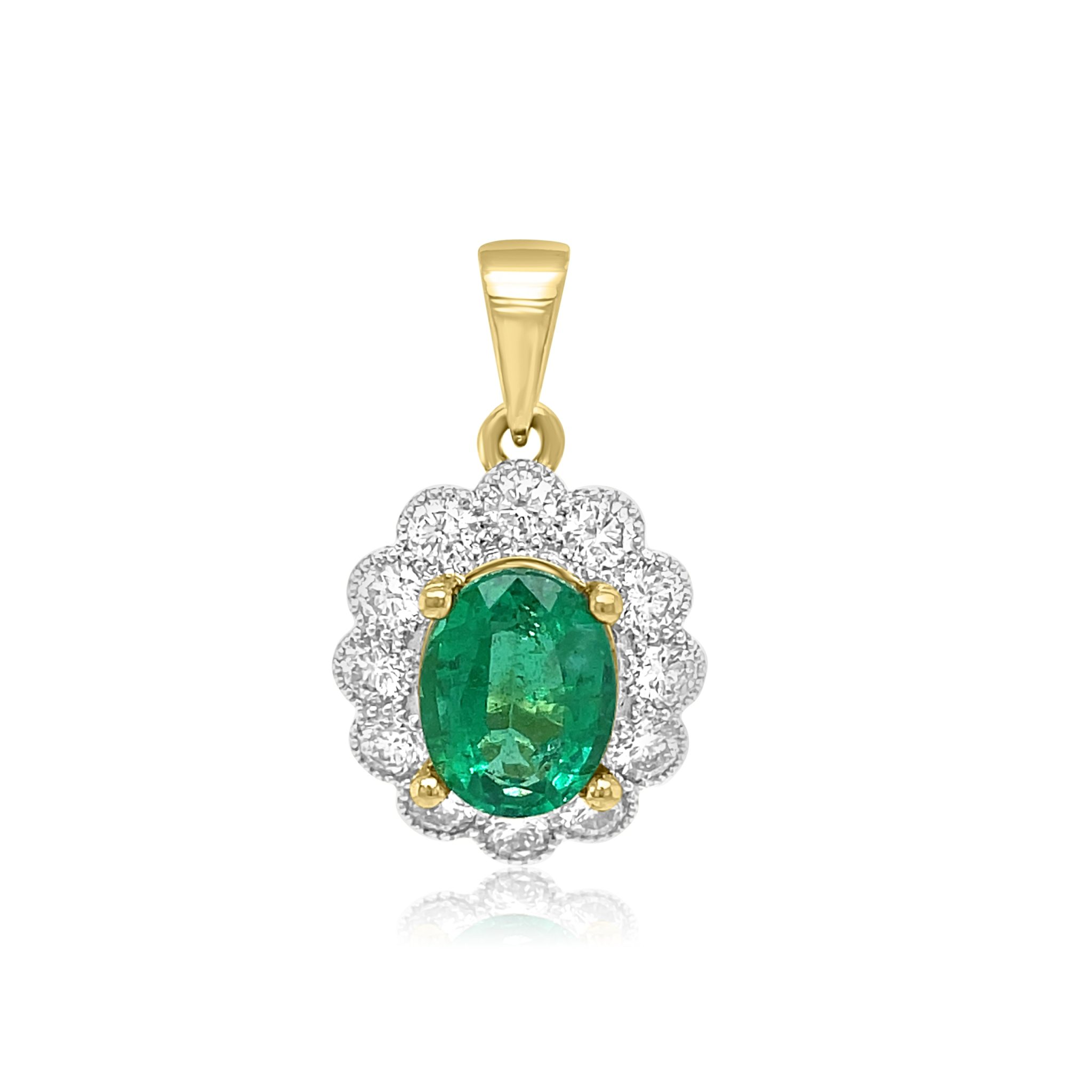 Unbelievable 14 karat yellow gold emerald and diamond pendant! The centerpiece of the pendant is a gorgeous 1.68ct oval cut natural emerald that is really green and bright. It is surrounded by 0.88cttw round brilliant diamonds accenting it beautifully. Abig beautiful stone and huge look for the money!