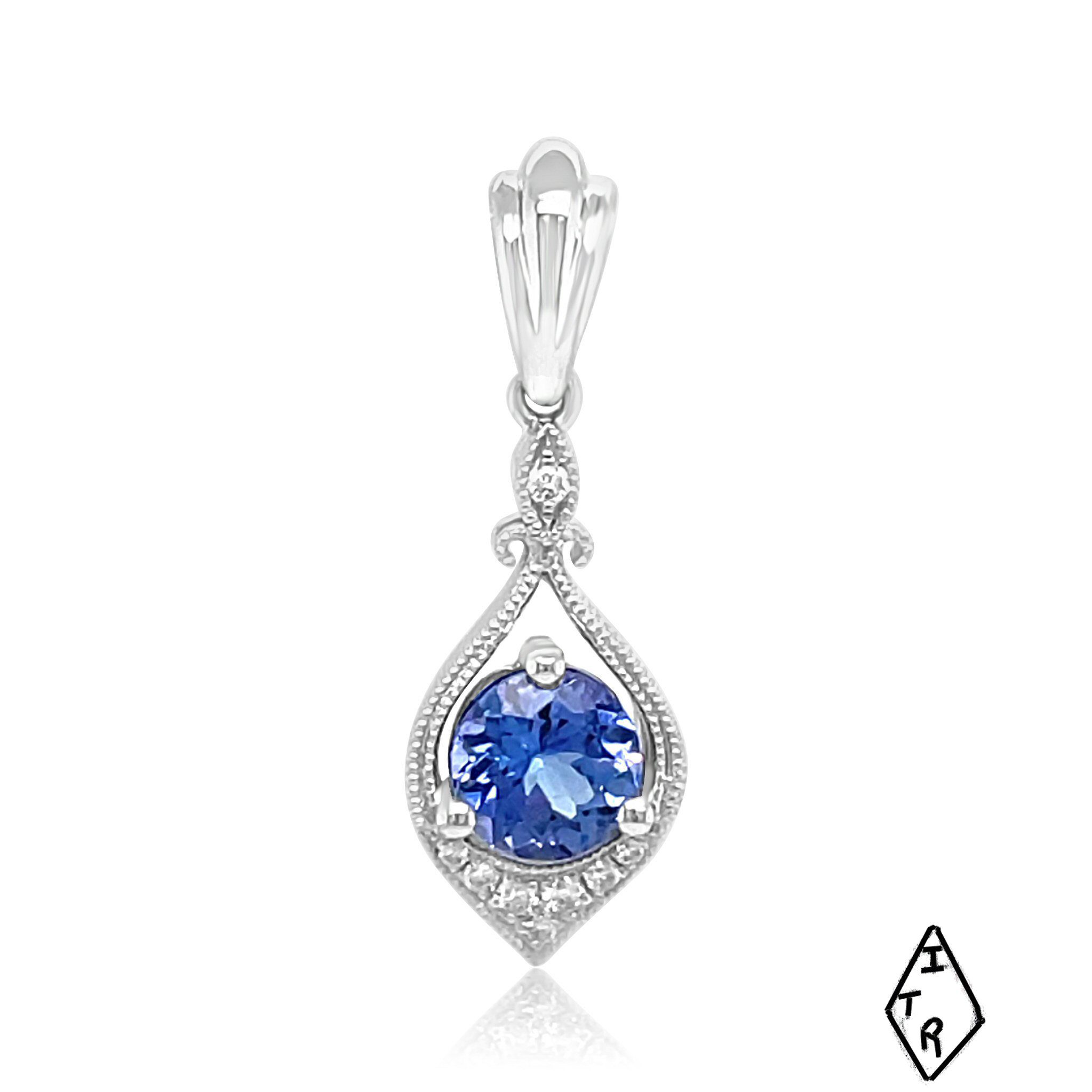 Gorgeous 14 karat white gold tanzanite and diamond pendant. The .48 carat round tanzanite is prong set in a pendant with 0.03cttw diamonds.