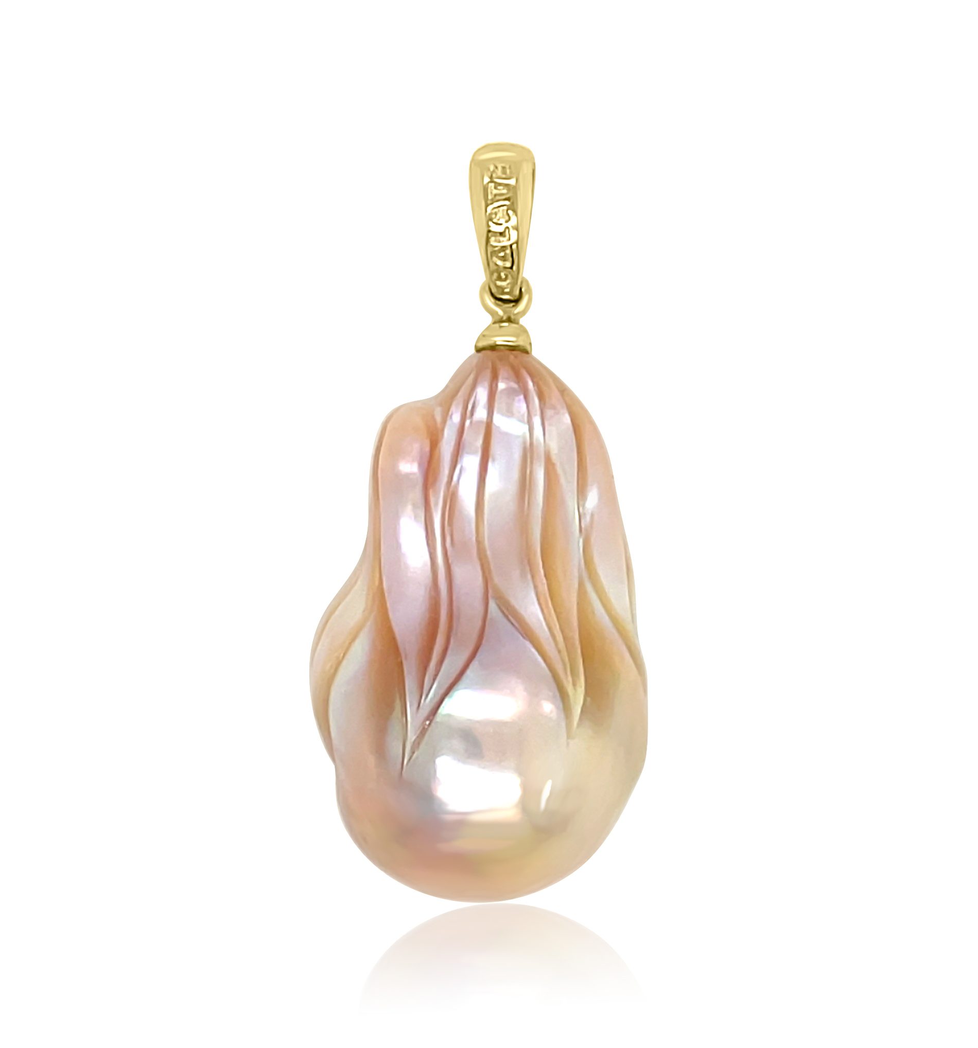 14 karat yellow gold bail supporting a 25mm mother of pearl. The Mother of Pearl has been carved out like a grotto to house a little yellow gold flower. Behind the flower is green, yellow, orange and pink created diamond druzy creating a sparkling colorful backdrop. Each one of these Mother of Pearl pendants is one of a kind. Designed and made by Chi. Galatea Jewelery By Artist. Chain not included.