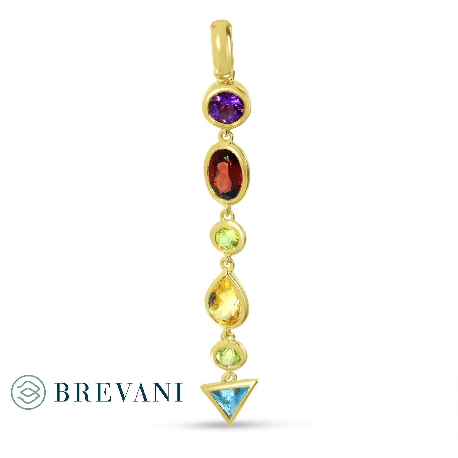 14 karat yellow gold multi colored gemstone of different shapes. From top to bottom they are: round amethyst, oval garnet, round peridot, pear shaped citrine, round peridot and triangular blue topaz. 2″ long. Chain not included. Matches E4398