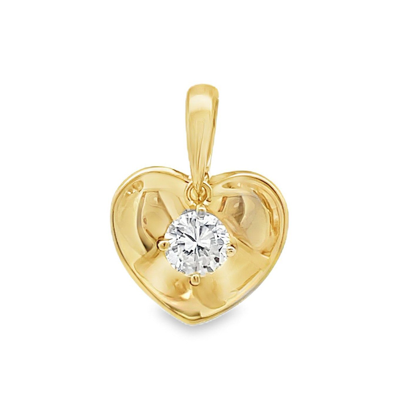 14 karat yellow small heart pendant with a dangling 4.4mm round brilliant cut diamond of VS clarity and G color. This is a deep cut 0.58ct diamond that is priced at the size of a 0.32ct diamond. A gorgeous, reasonably priced diamond pendant!