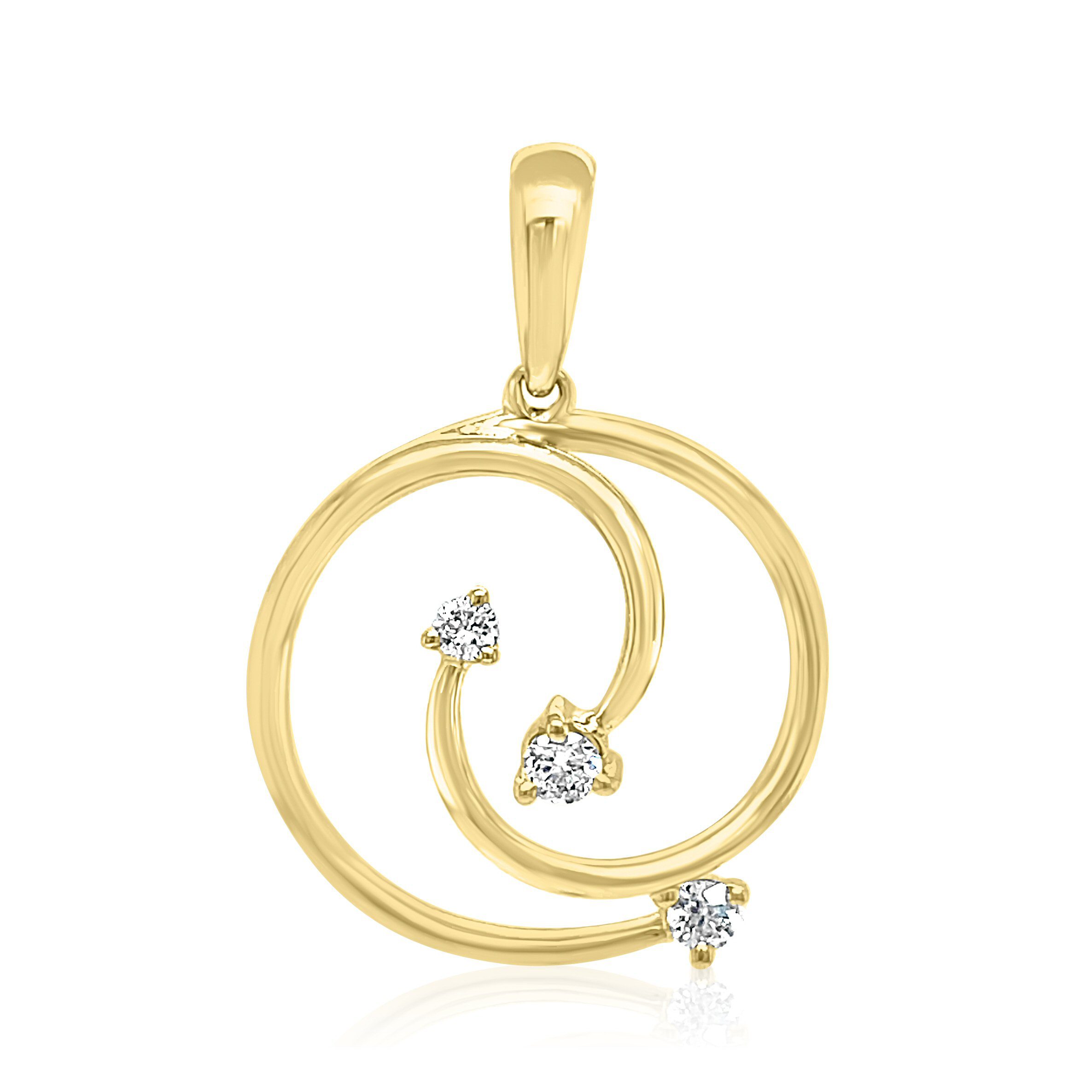 Unique and pretty 14 karat yellow gold diamond swirl necklace with 3 round brilliant cut diamonds weighing 0.10 cttw. Chain not included.