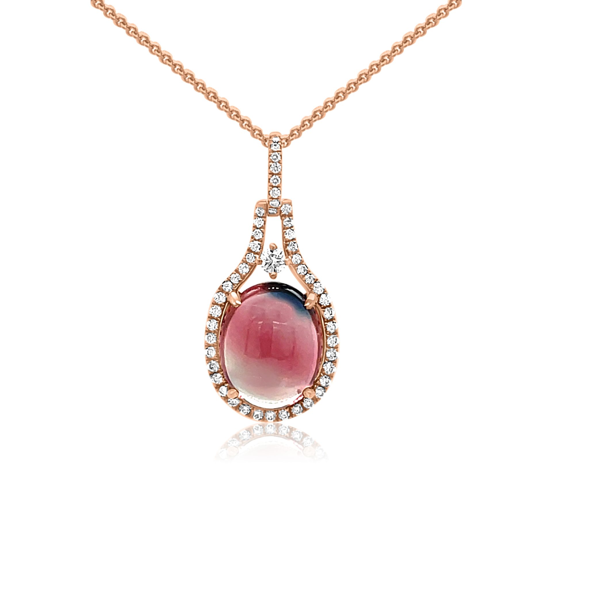 Lovely 14 karat rose gold tourmaline and diamond necklace. The 3.80 carat round cabachon cut tourmaline is prong set and surrounded by .17cttw round brilliant cut diamonds: a halo of diamonds surrounding the stone, a diamond directly above, and diamonds up the bail.
