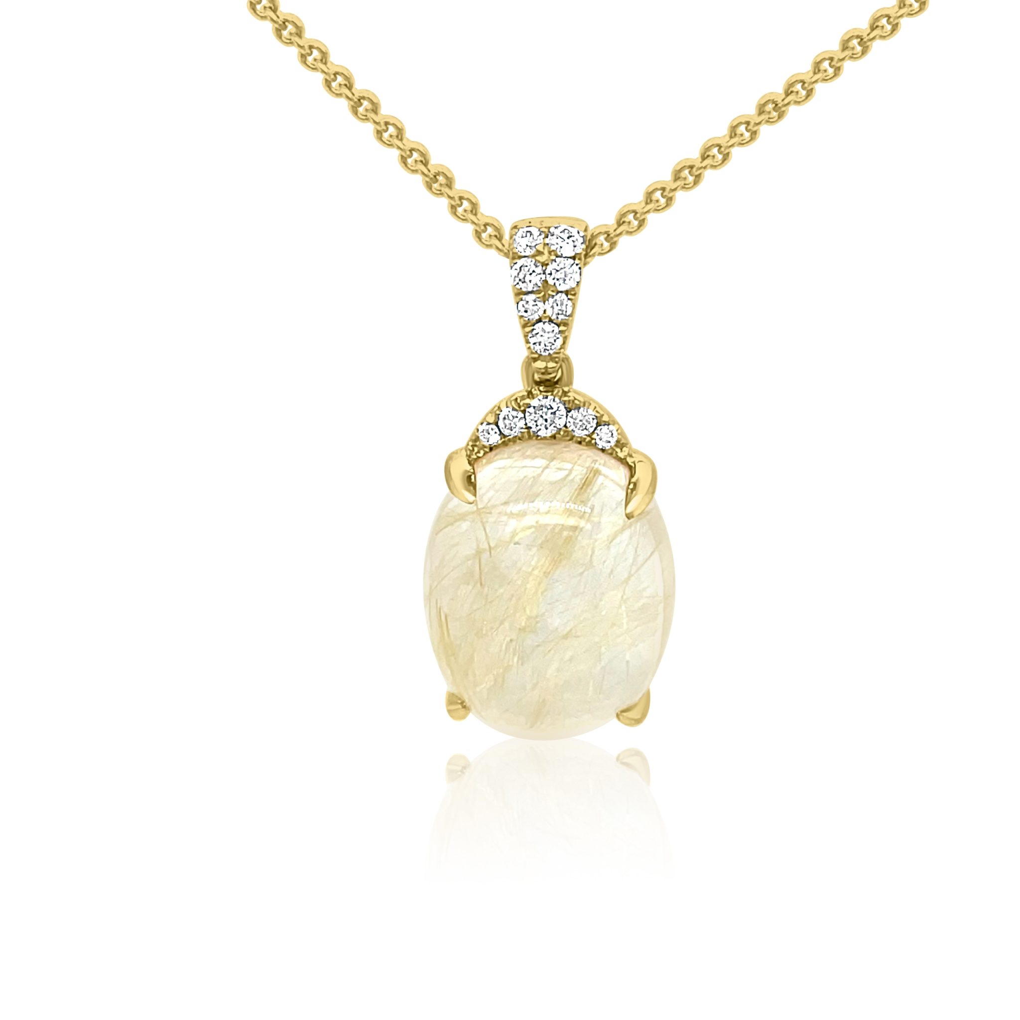 Gorgeous 14 karat yellow gold rutilated quartz and diamond necklace. This 5.33 carat rutilated quartz is prong set and accented by .11 cttw round brilliant cut diamonds above and on the bail. Chain is adjustable from 16-18″.