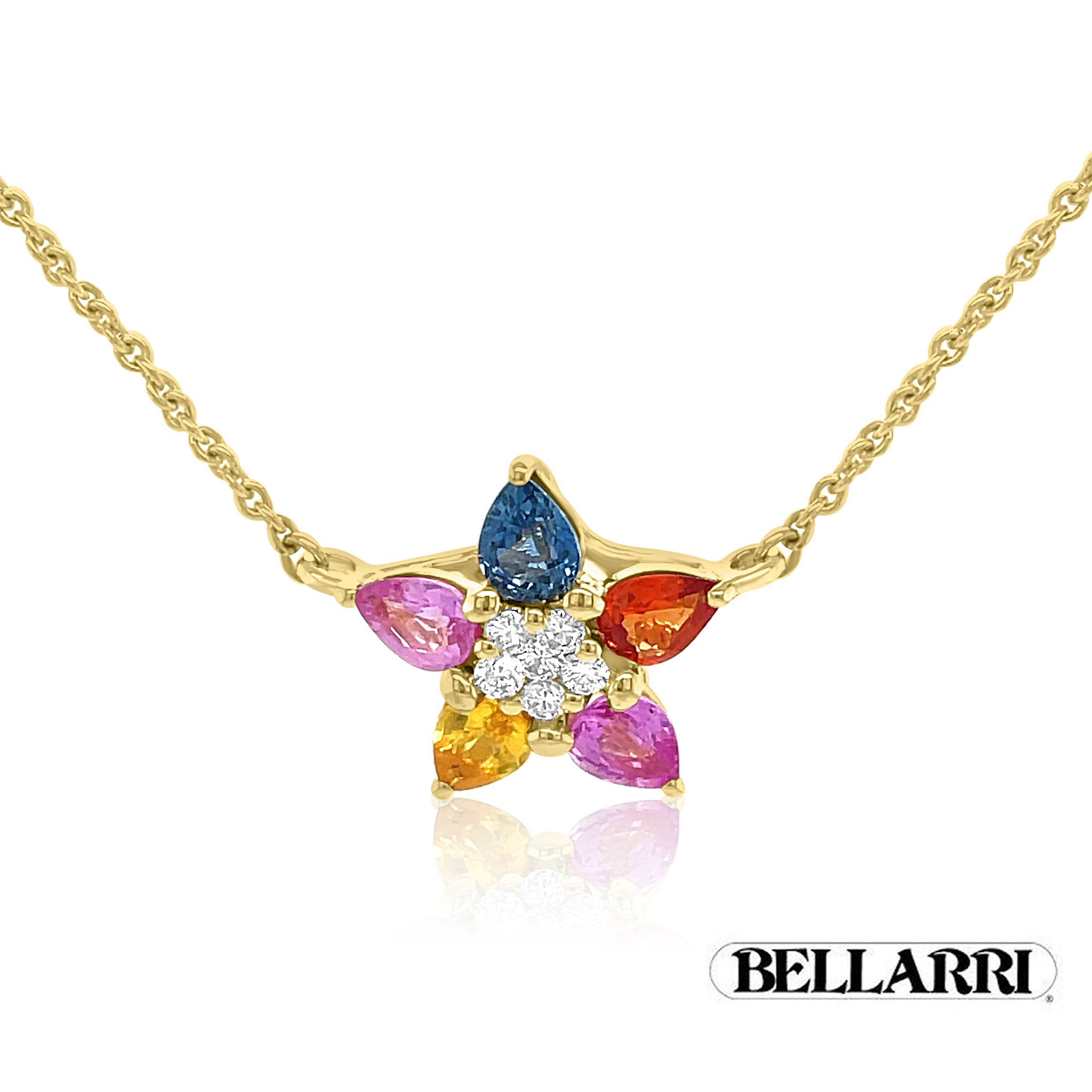 Pretty and colorful 14 karat yellow gold multi-color sapphire flower necklace. There are 2.26 cttw multi colored sapphires, in shades of blue, orange, yellow, and pink, that make up the petals of the “flower” and 0.18 cttw of diamonds in the center. Stunning!