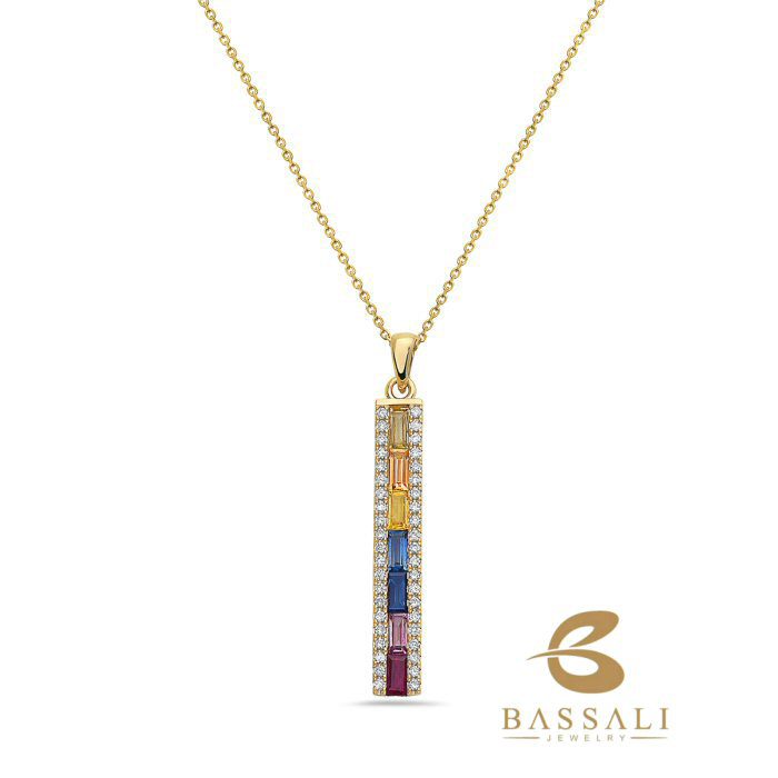 This stunning 14 karat yellow gold sapphire and diamond bar necklace by Bassali is the epitome of modern elegance. Featuring a radiant array of baguette shaped .96cttw multi-colored sapphires, and surrounded by .27cttw sparkling diamonds on either side, this piece exudes luxury and timeless beauty.
