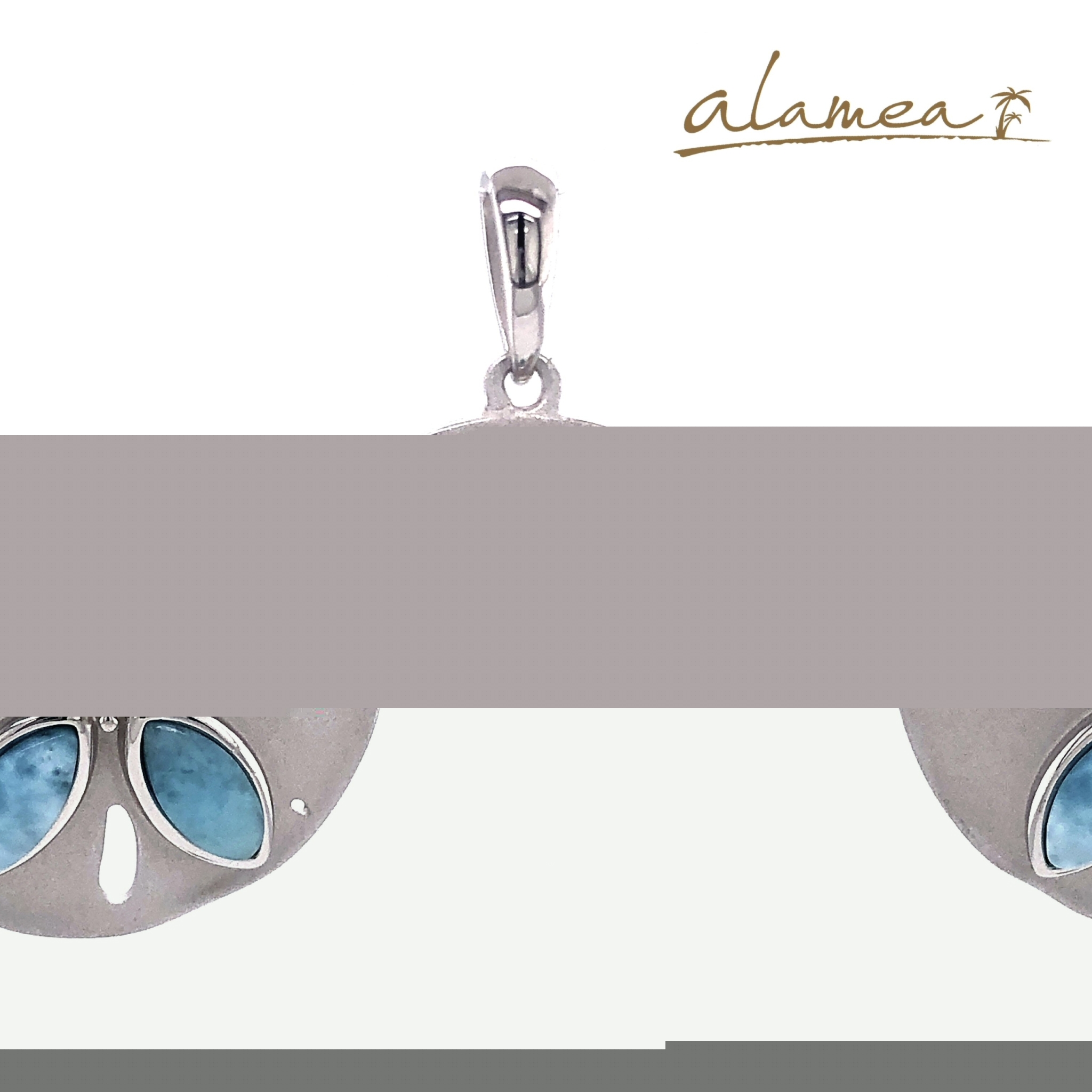 Sterling silver larimar sand dollar pendant with a white topaz in the center. The 5 petals of the sand dollar are the larimar and there is a white topaz in the center. The pendant and chain are both rhodium plated to be hypo-allergenic and tarnish free. The chain is adjustable from 17-18″ long.