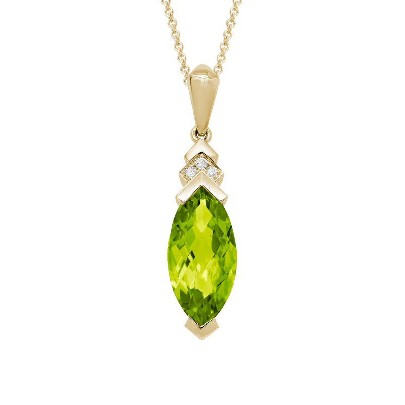 Exquisite14 karat yellow gold peridot and diamond necklace. The centerpiece of this beautiful necklace is a 3.3 carat marquise shaped peridot. The peridot is set with two v-shaped prongs on the top and bottom, accented by three round brilliant cut .02cttw diamonds above the stone.