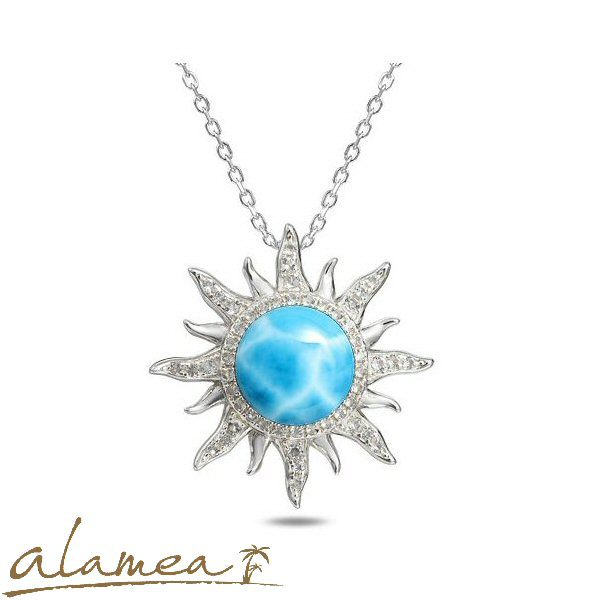 Sterling silver h sun head necklace designed by Alamea of Hawaii. The center of the sun is larimar and the rays sparkle with white topaz. It is 1″ in diameter. The necklace is rhodium plated to be hypoallergenic and tarnish- free. The chain is adjustablefrom 17-18″ long