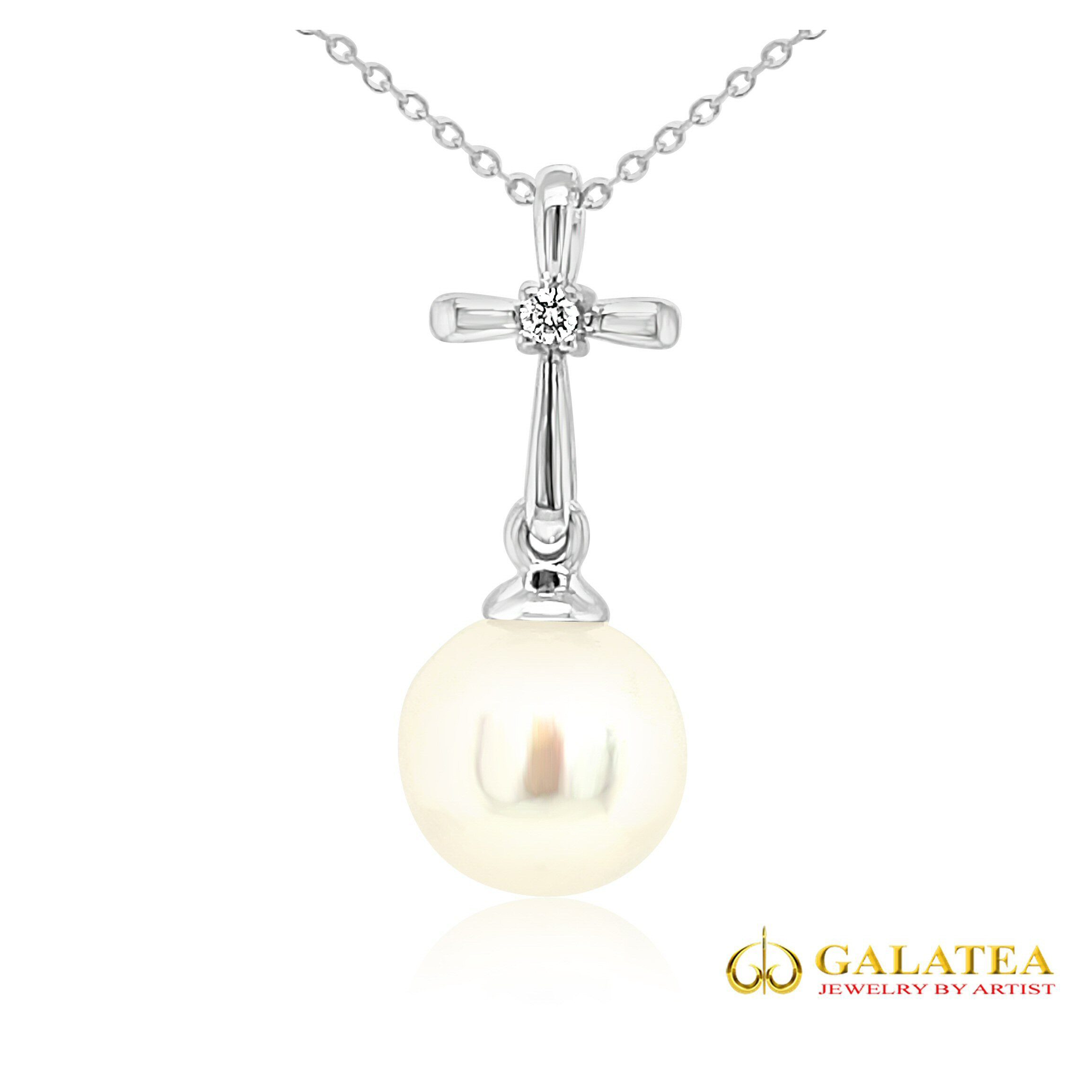 14 karat white gold “Hallow” cross and “Bible in a Pearl” necklace by Galatea, Jewelry by Artist. There is a .02ct round brilliant cut diamond in the center of the cross and below the cross is a 9.5-10mm cultured freshwater pearl, grown around a computerchip, containing the words of the Bible inside.