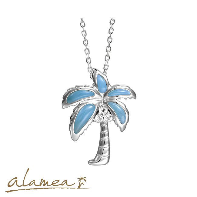 Sterling silver palm tree necklace designed by Alamea of Hawaii. There are 5 palm tree leaves made of bezel set larimar with 3 bezel set white topaz coconuts. The palm tree has a hidden bail and is 1″ long. The necklace is rhodium plated to be hypoallergenic and tarnish- free. The chain is adjustable from 17-18″ long.