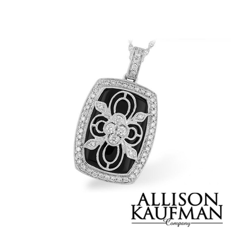 This exquisite 14 karat white gold necklace features a vintage style setting with onyx and diamond accents. There is a rectangular onyx set under a vintage style floral design with round brilliant cut diamonds within and around the design in a halo, and along the bail, totaling 0.38 cttw.