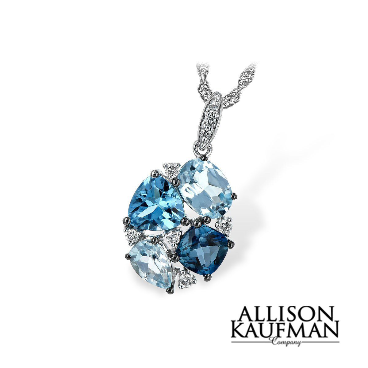 Absolutely stunning 14 karat white gold blue topaz and diamond pendant. There are 2.60 cttw blue topaz in varying shapes and shades and 0.10 cttw diamonds that make up an oval shaped pendant. Lovely and unique!