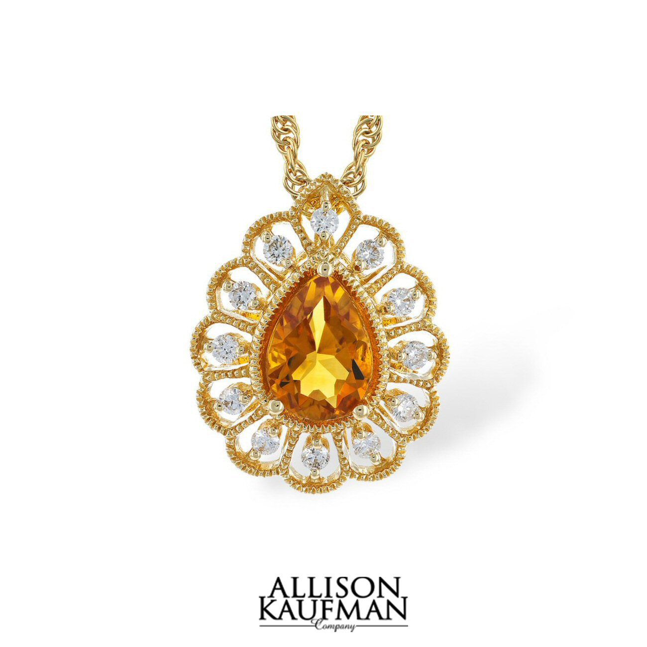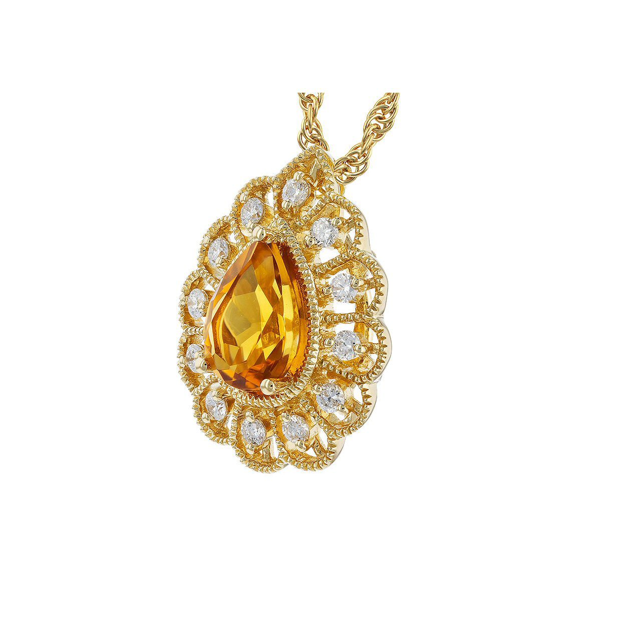 Radiant 14 karat yellow gold citrine and diamond pendant. The centerpiece of this pendant is a gorgeous 0.62 carat pear shaped citrine, surrounded by a halo of 0.13cttw diamonds.
