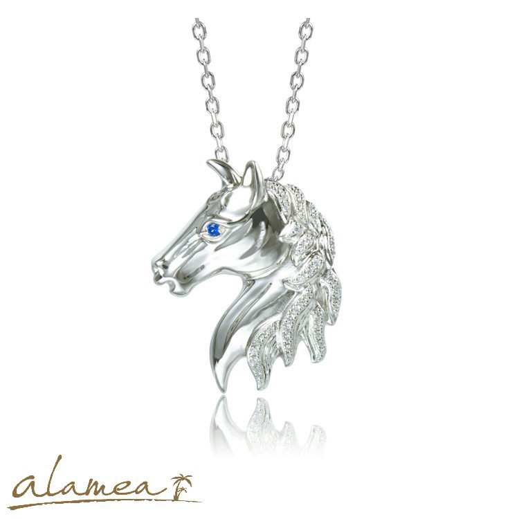 Sterling silver horse head necklace designed by Alamea of Hawaii. The horse head is high polished with a flush set blue topaz eye. The mane is textured and the pendant is 1″ long.. The necklace is rhodium plated to be hypoallergenic and tarnish- free. Thechain is adjustable from 17-18″ long