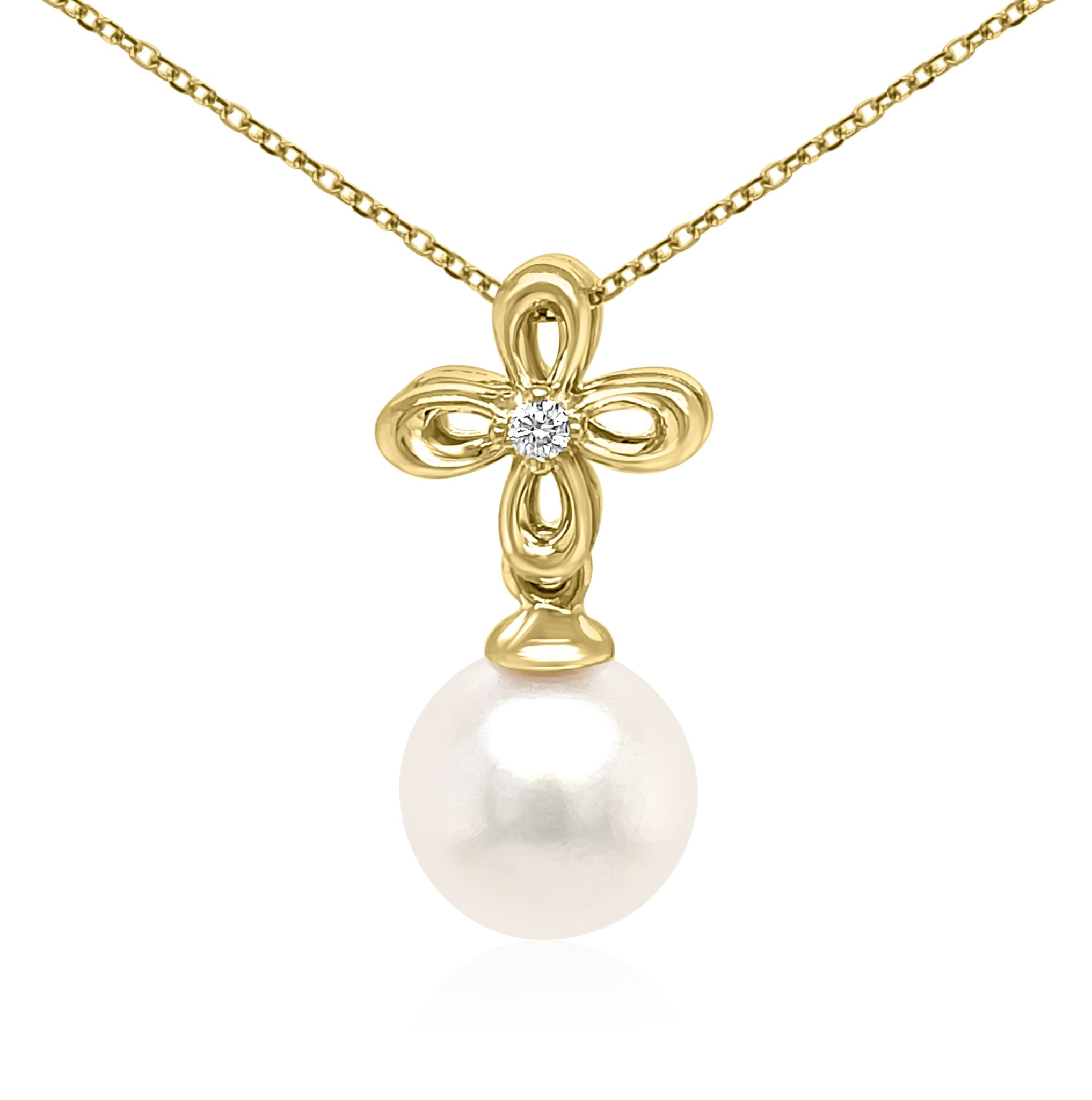 14 karat yellow gold “Grace” cross and “Bible in a Pearl” necklace by Galatea, Jewelry by Artist. There is a .02ct round brilliant cut diamond in the center of the cross and below the cross is a 9.5-10mm cultured freshwater pearl, grown around a computerchip, containing the words of the Bible inside.