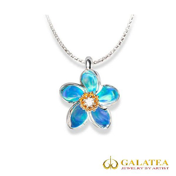 Sterling silver blue plumeria necklace created by Galatea, Jewelry by Artist. There is a created opal wrapped around the yellow gold center, containing a .03ct round brilliant cut diamond. The opal reflects off of the silver petals, creating the vibrant blue color.