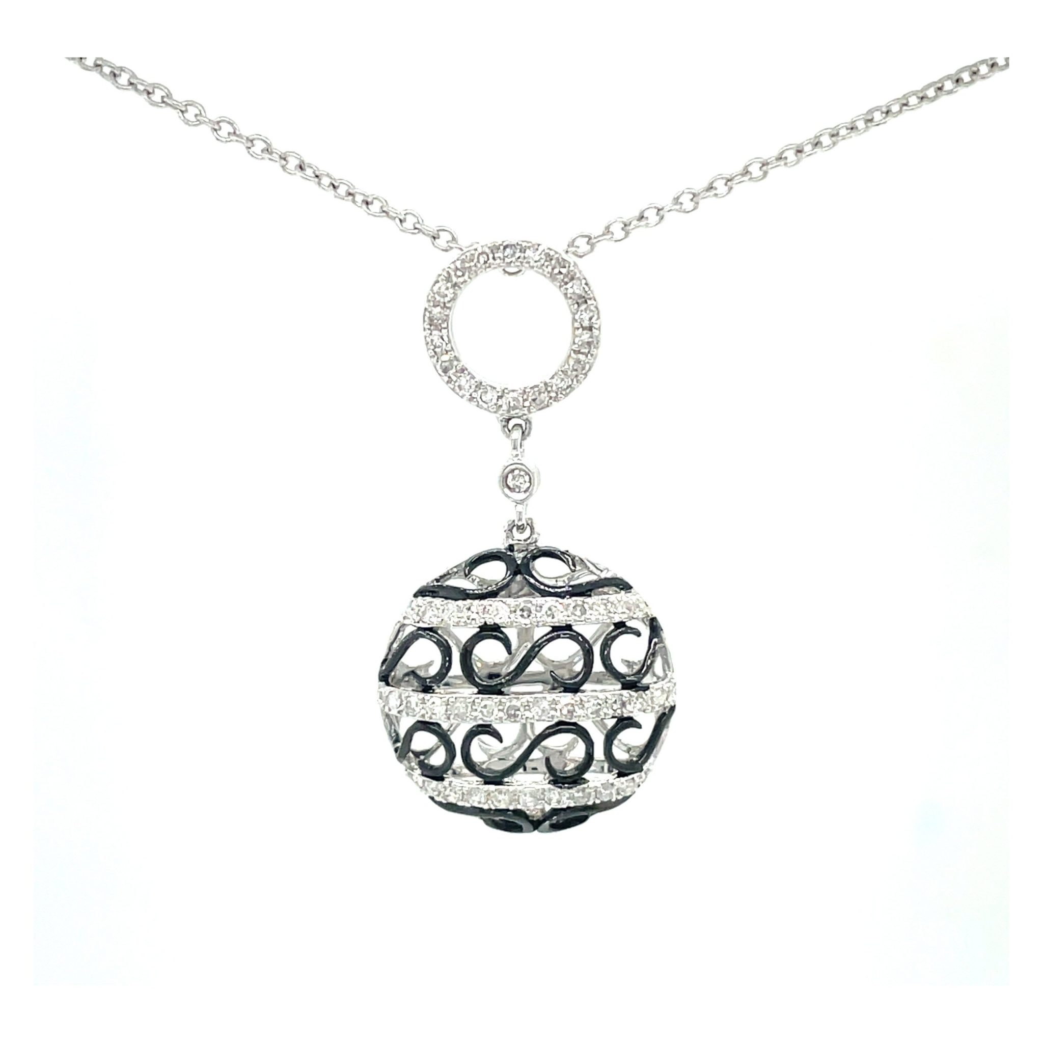Beautiful 14 karat white gold black rhodium and diamond necklace. The centerpiece of this necklace is a round pendant with .22 cttw round brilliant cut diamonds and swirls of black rhodium, hanging on an 18″ chain.
