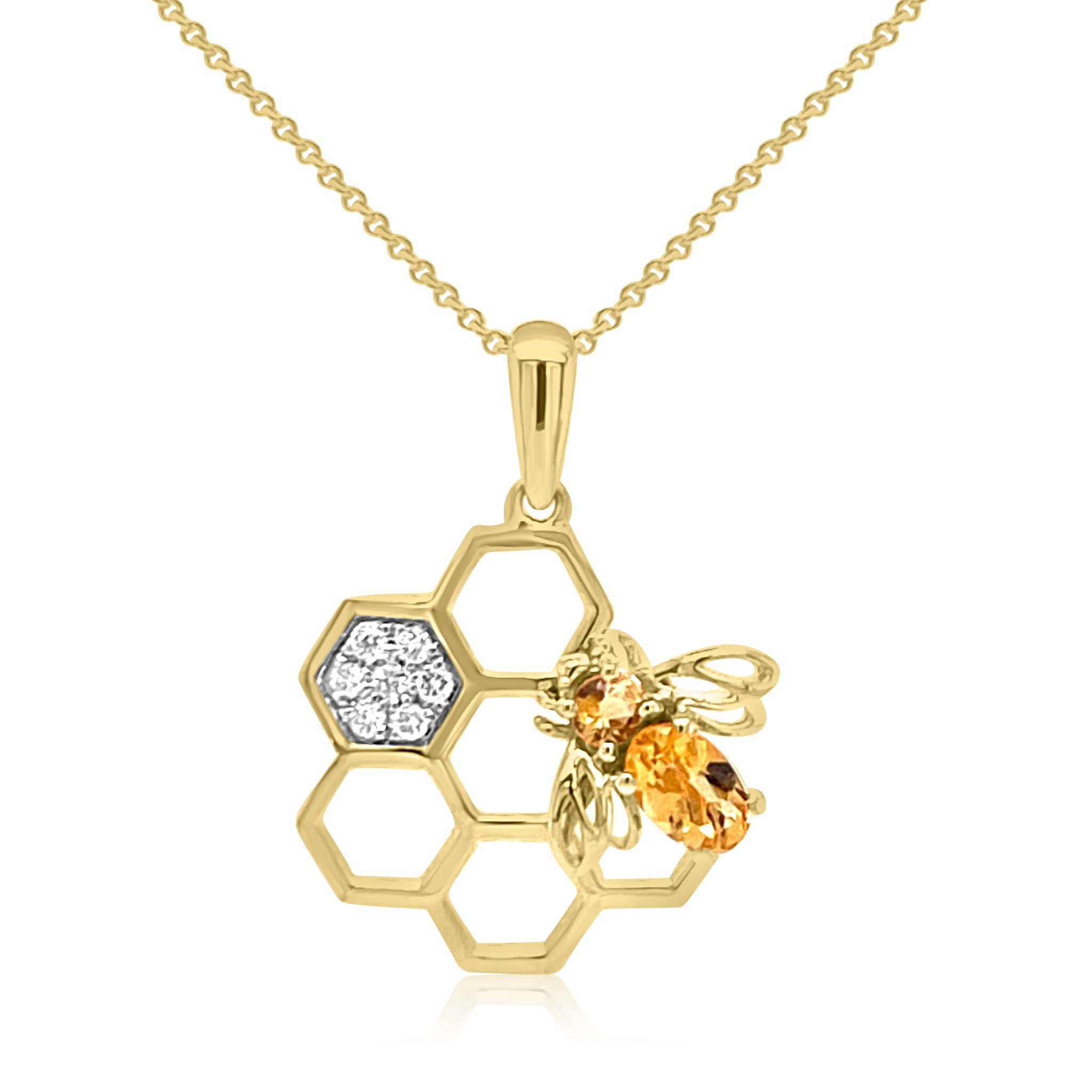 14 karat yellow gold honeycomb necklace. There are .06 cttw round brilliant cut diamonds prong set in the honeycomb. Opposite the diamonds is an adorable little bumblebee with citrines in the head and the body. The chain is adjustable from 16-18″ long.